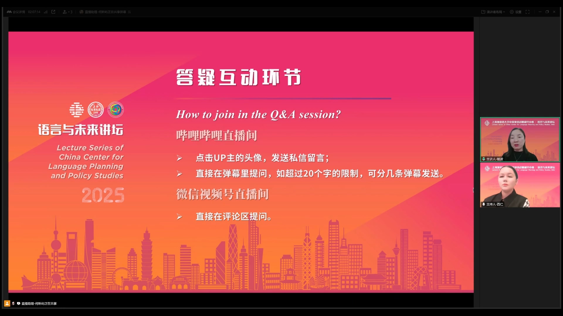 在讲座最后的互动环节,杨波教授与听众探讨了语言传播效果的评估维度,包括机构数量、语言考试参与度、教育合作项目等显性指标,以及社交媒体影响力、学术语言使用等隐性层面。她强调,中亚国家对意识形态推广的敏感性要求传播策略更注重“柔性叙事”,未来可借鉴多国经验,通过设立区域常设机构、深化数字教育合作等方式提升传播效能。