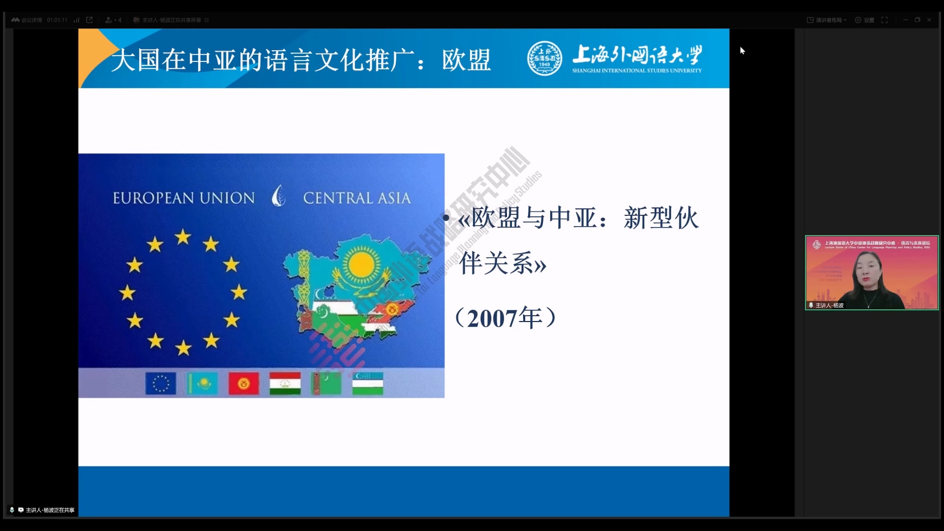 讲座中,杨波教授指出中亚作为“欧亚大陆的文明十字路口”,其语言生态折射出大国博弈的复杂图景。在中亚国家“去俄语化”与语言竞争的背景下,美国、俄罗斯、欧盟、土耳其等行为体以语言为媒介展开战略布局:美国通过“美国中心”“美国角”等机构构建成熟的语言推广体系,欧盟以“软安全”为切入点渗透教育合作,俄罗斯依托历史纽带巩固俄语学术地位,土耳其则借助突厥语族优势推动文化认同。