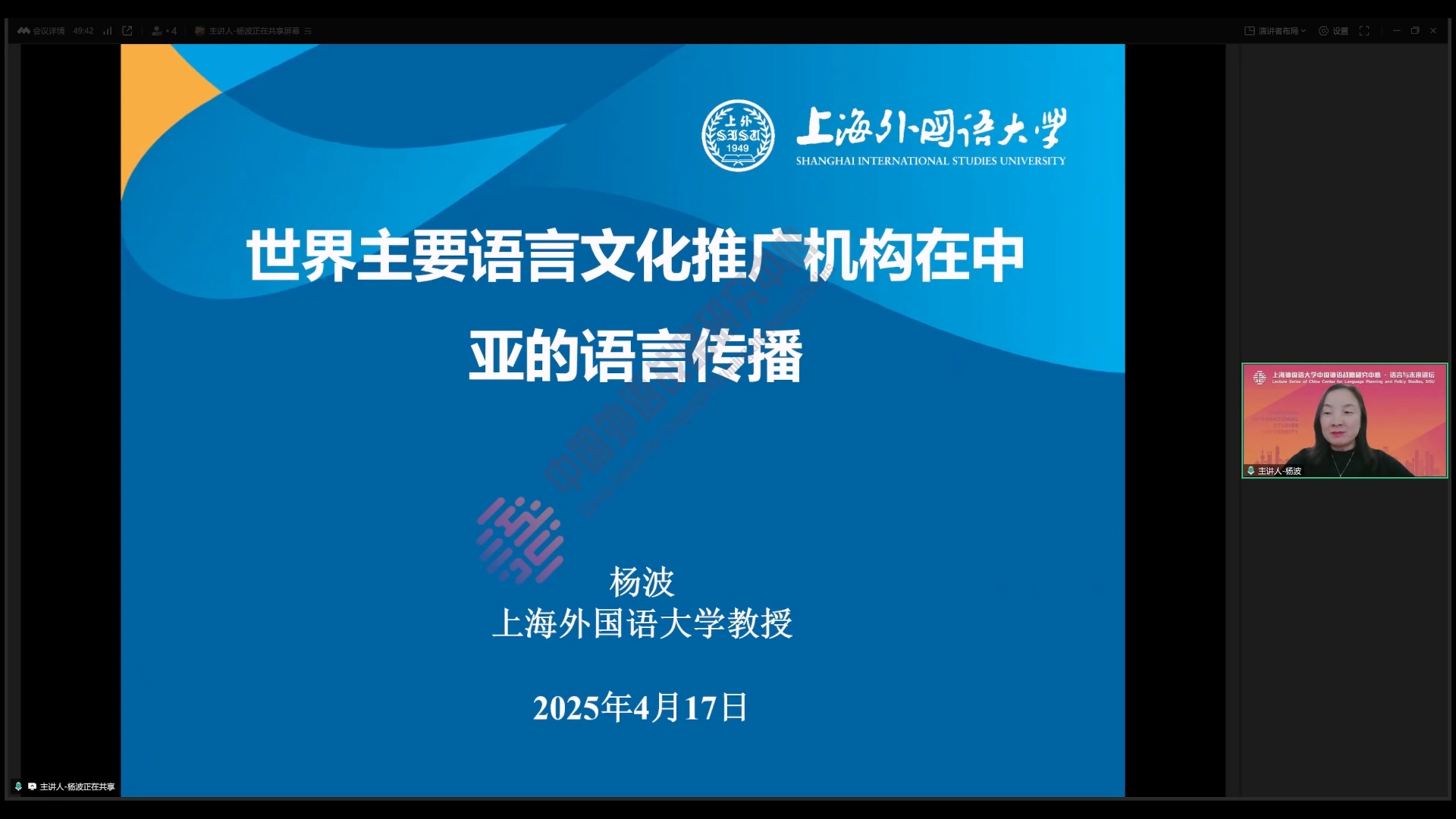 2025年4月17日,上海外国语大学高级翻译学院副院长杨波教授在中国外语战略研究中心“语言与未来讲坛”做了题为《世界主要语言文化推广机构在中亚的语言传播》的学术讲座。本次讲座由海南大学阿衣西仁·居马巴依副教授主持,数百名师生线上参加了本次讲座。