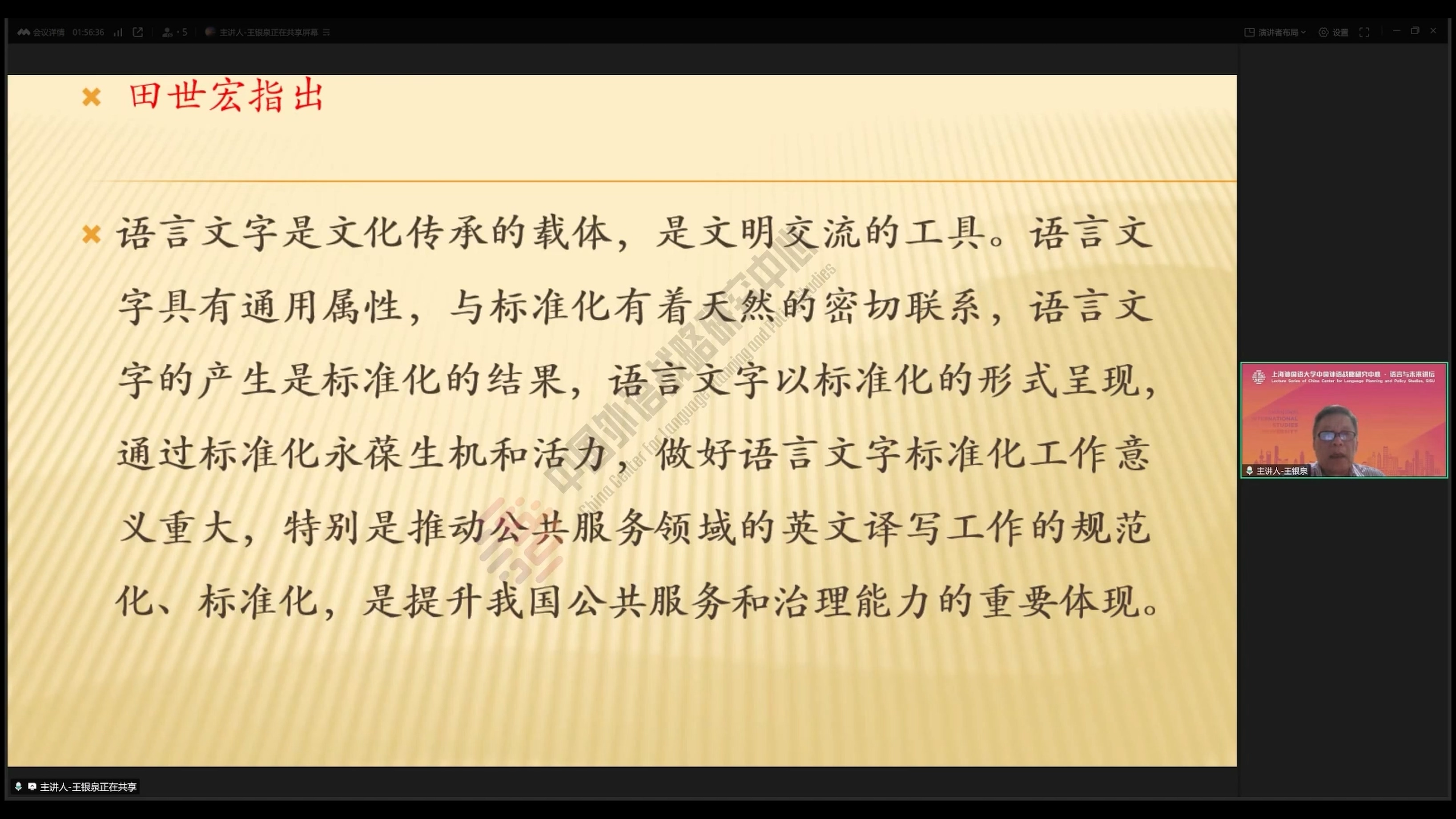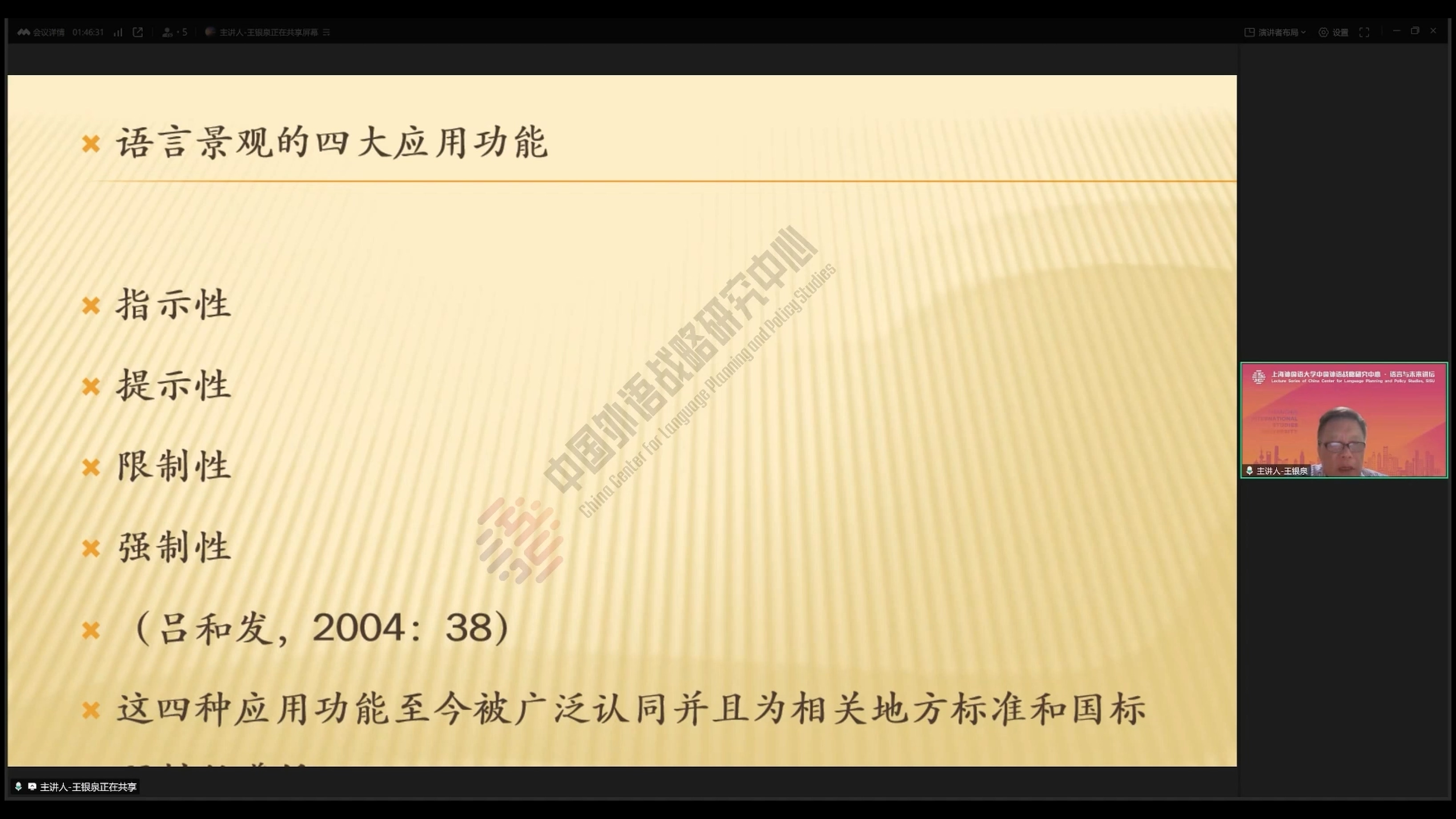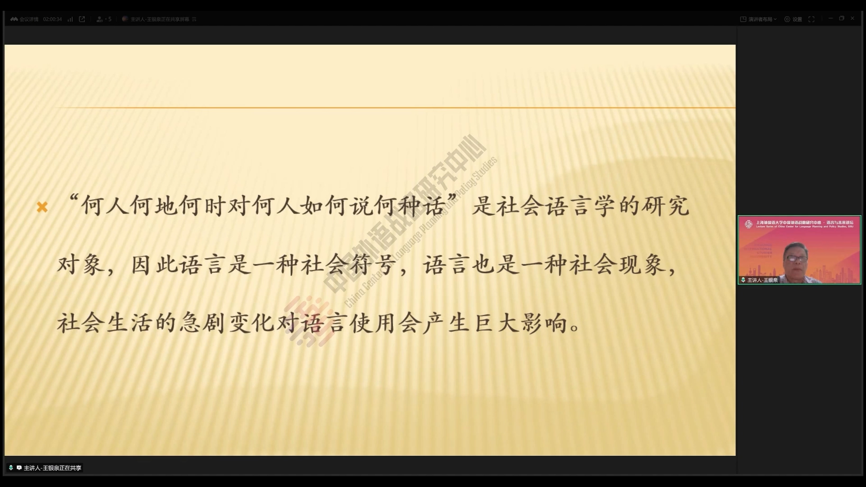 2025年5月15日,南京农业大学王银泉教授做客中国外语战略研究中心“语言与未来讲坛”,做了题为《社会语言学视域下的语言景观翻译与外语教育政策反思》的学术讲座。本次讲座由上海外国语大学中国外语战略研究中心副主任余华副教授主持,数百名师生线上参加了本次讲座。