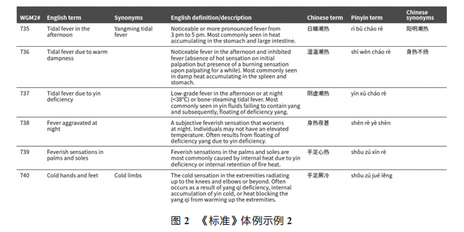 在示例中,第735条“日晡潮热”列出中文同义词“阳明潮热”和英文同义词“Yangming tidal fever”,第736条“湿温潮热”只列出中文同义词“身热不扬”,第740条“手足厥冷”只列出英文同义词“Cold limbs”。