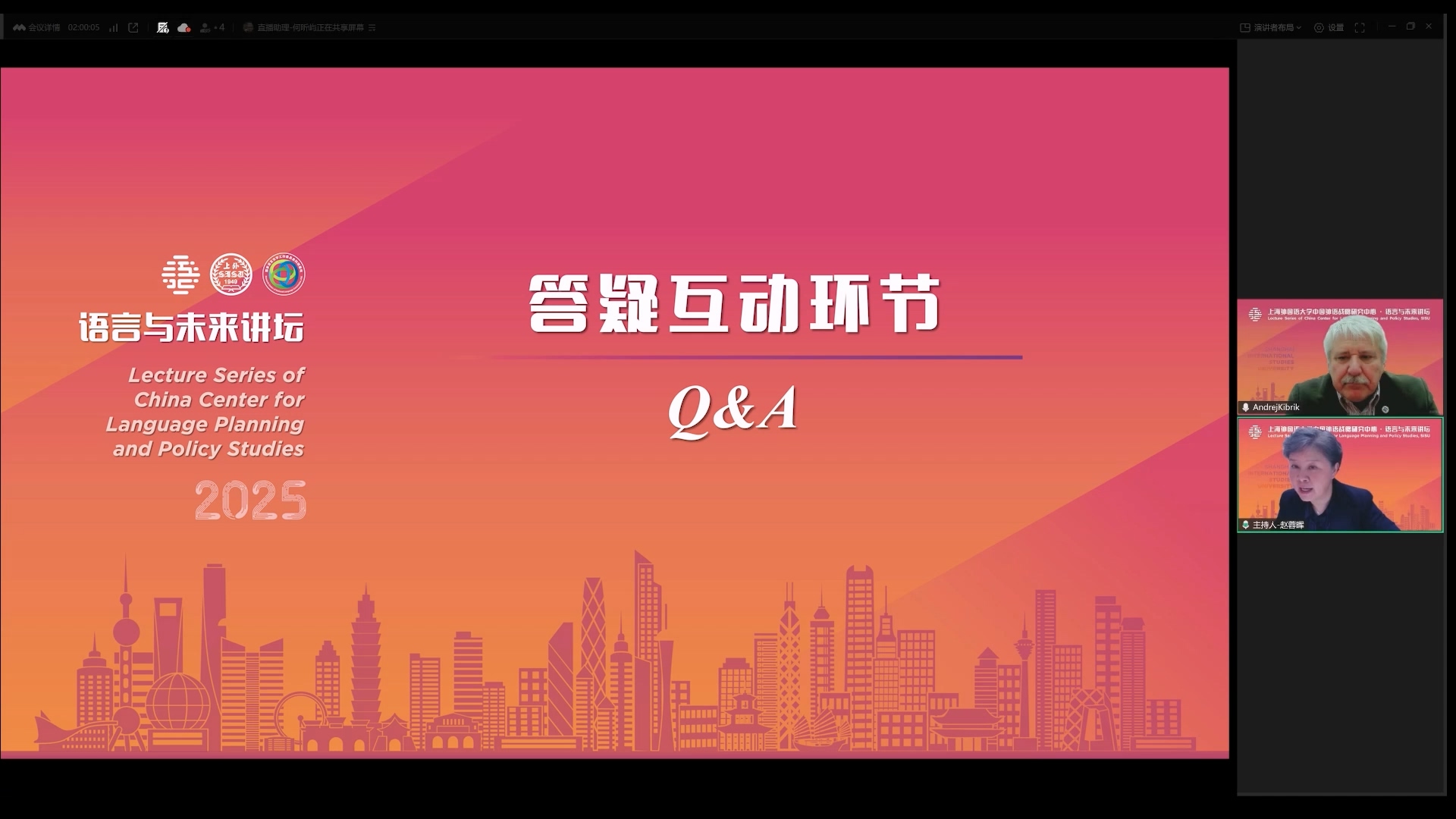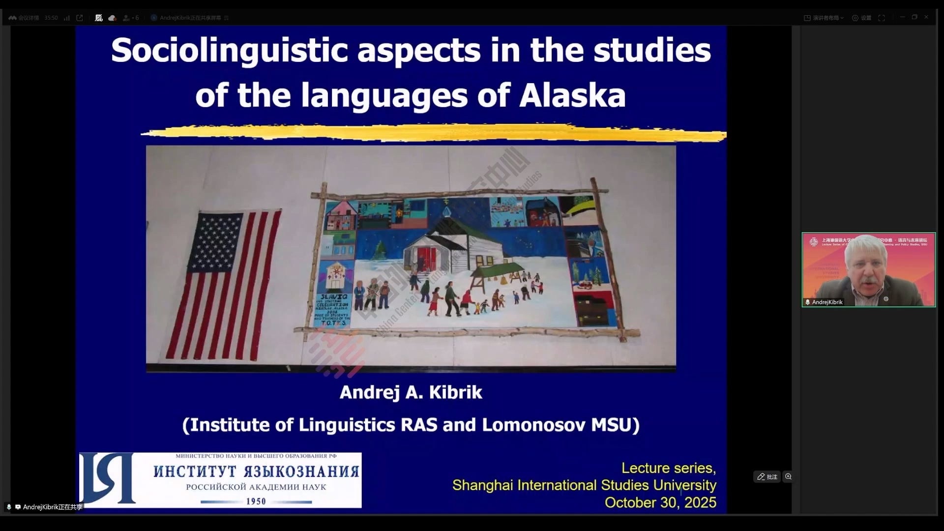 2025年10月30日,俄罗斯科学院语言学研究所基布里克教授做客中国外语战略研究中心“语言与未来讲坛”,做了题为《阿拉斯加诸语言的社会语言学探析》的学术讲座。本次讲座由中心执行主任赵蓉晖教授主持,百余位师生线上参加本次讲座。