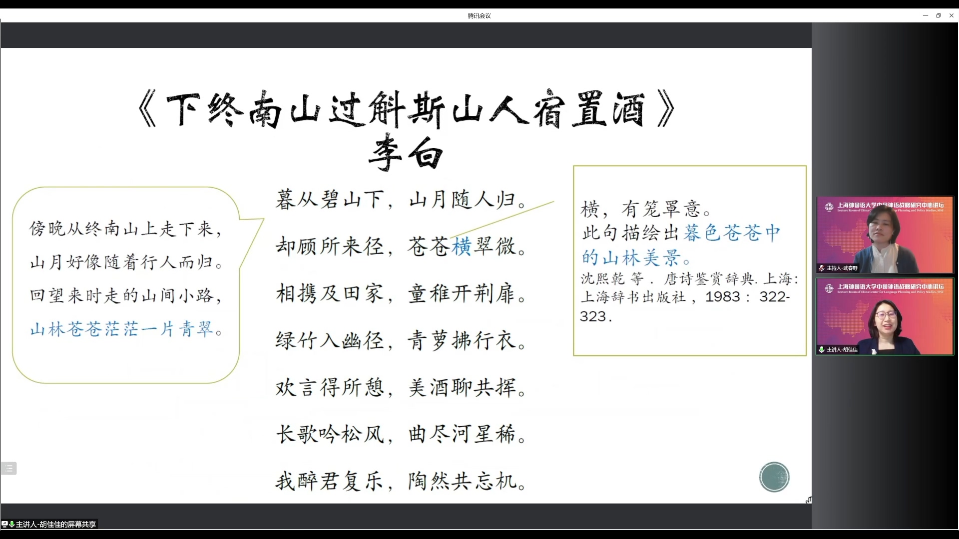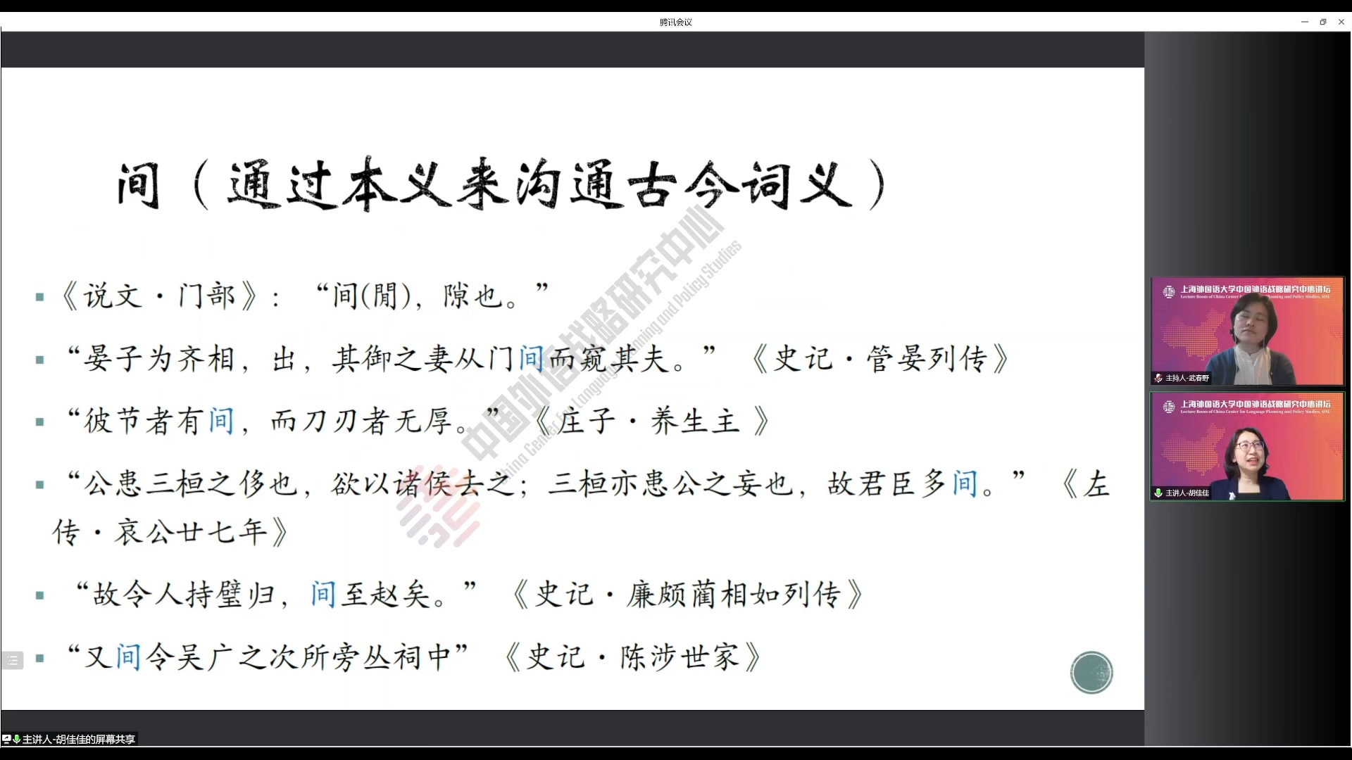 2022年4月28日晚,北京师范大学文学院副教授、中国文字整理与规范研究中心专职研究员胡佳佳于上海外国语大学举办的“中国外语战略研究中心讲坛”作了题为《汉语古今词义的沟通——利用汉字的意义》的学术讲座。讲座由中心研究员武春野主持,400余位校内外师生线上参加。