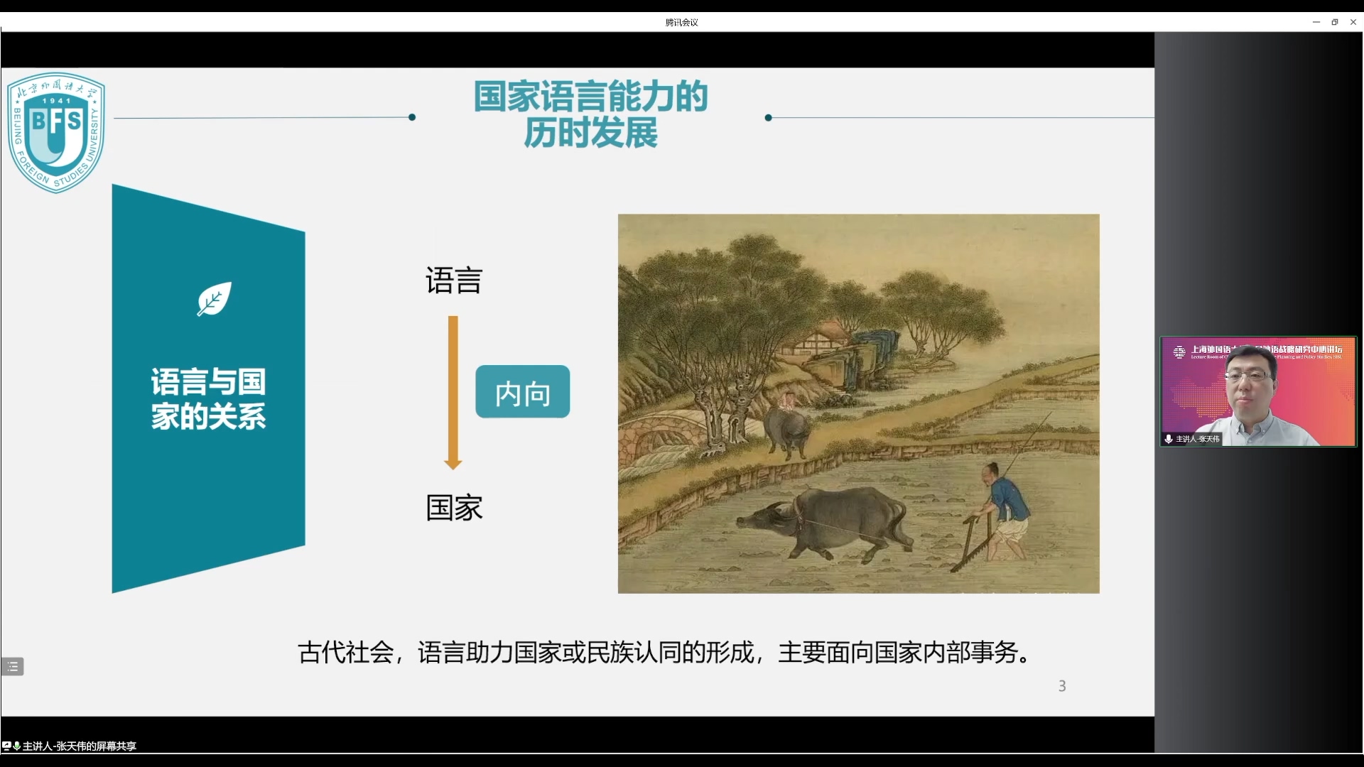 张天伟教授从国家语言能力的历时发展、国家语言能力指数的意义与作用、国家语言能力指数指标体系、研究方法、结果与分析、启示与思考等进行阐述。张老师首先介绍了古今中外语言和国家间关系的发展阶段,即内向、共生和外向关系。他指出,国家语言能力是一个国家软实力和综合国力的重要体现,越来越多的国家意识到国家语言权力和世界语言多样性的重要性,在这个过程中逐渐形成了国家语言能力的概念及相关思考。他介绍了文献研究和指数研究的优缺点,对国家语言能力指数的意义和作用进行了阐述,从而引出国家语言能力指数的定义以及量化三要素——数据、合成和权重。
