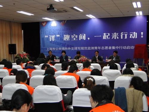 仪式上,团市委青年志愿者工作部负责人为公共场所外文译写规范监测青年志愿者服务队授旗。今后,志愿者将以英、日、韩、俄等四个语种为主,定期在主要商业街区、重点交通枢纽等公共区域开展“译”测服务。袁雯和冯庆华共同为设在市教育督导事务中心(市教育行政执法事务中心)的“上海市公共场所外文译写规范监测志愿者培训与研究基地”揭牌,该基地的主要职能是对志愿者进行业务培训、开展相关政策研究、加强交流合作,为外文译写规范监测志愿者工作提供强有力的理论支撑和智力保障。