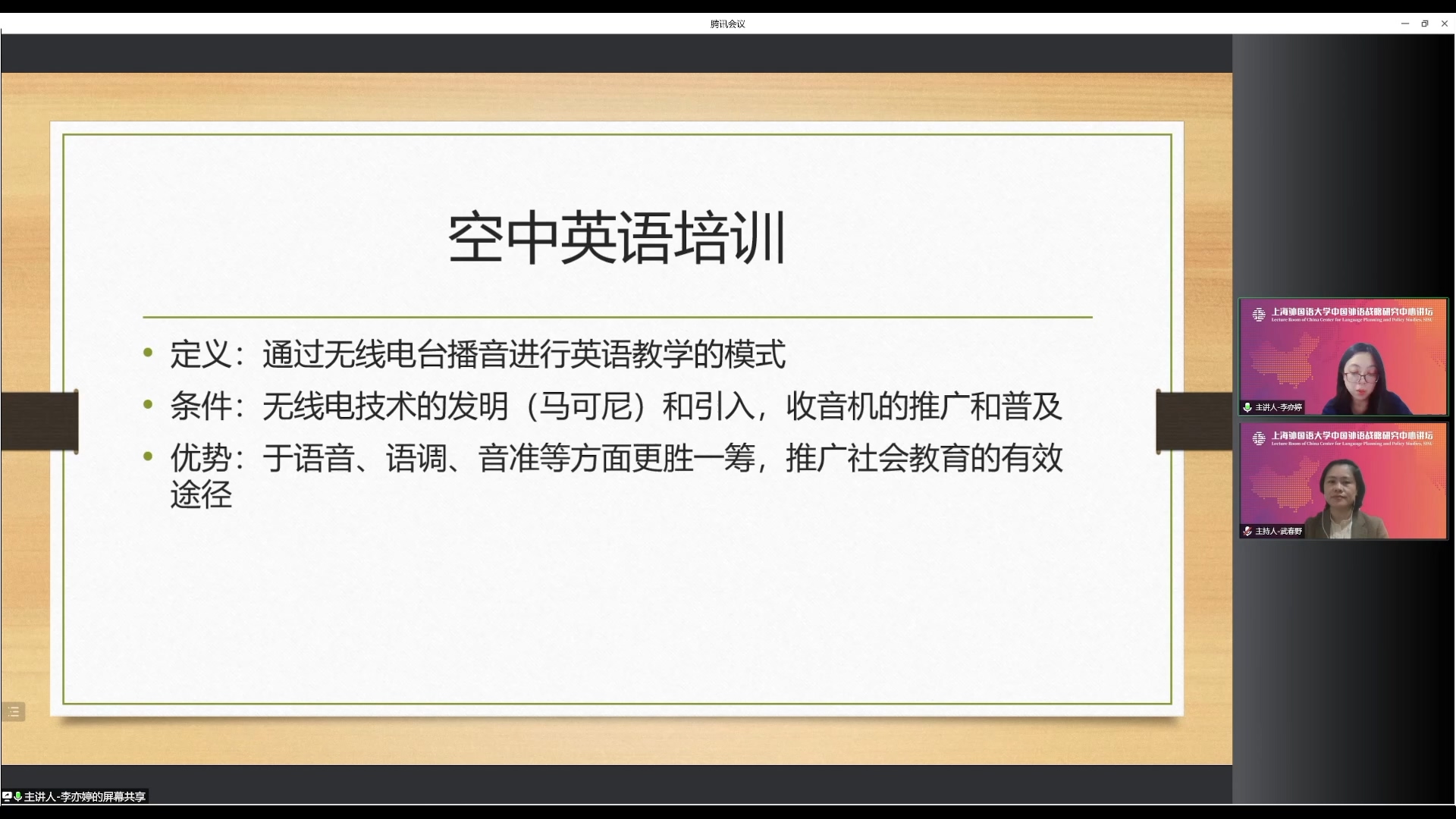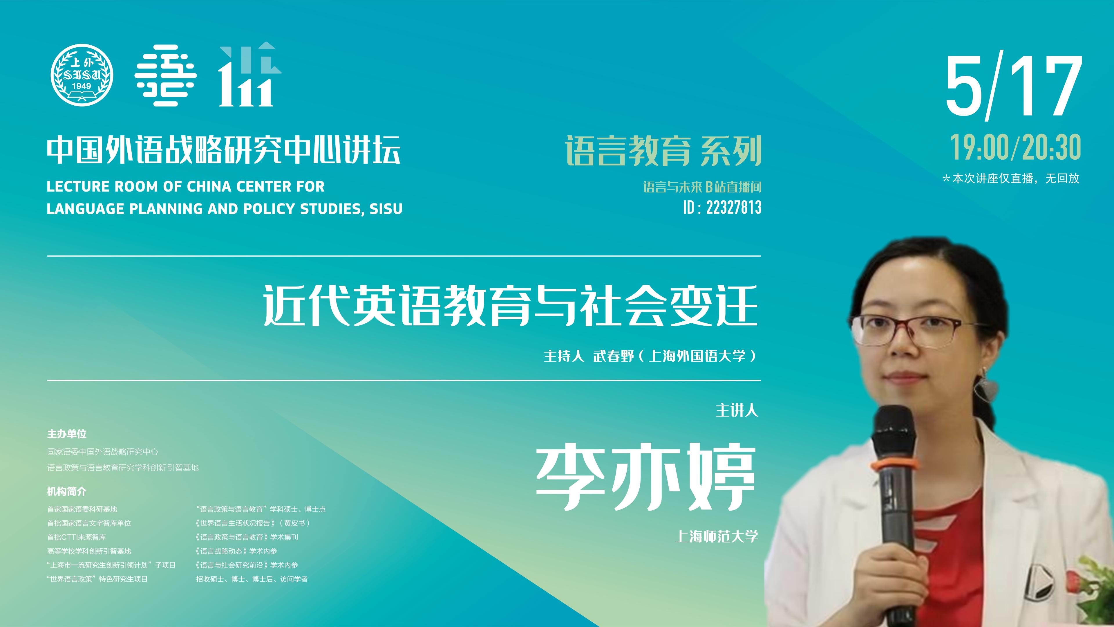 2022年5月17日晚,上海师范大学都市文化研究中心博士、上海社会科学院社会科学杂志社编辑李亦婷做客“中国外语战略研究中心讲坛”,做了题为《近代英语教育与社会变迁》的学术讲座。讲座由中心助理研究员武春野主持,来自全国各大高校和研究机构的师生以在线的方式参加了本次讲座。