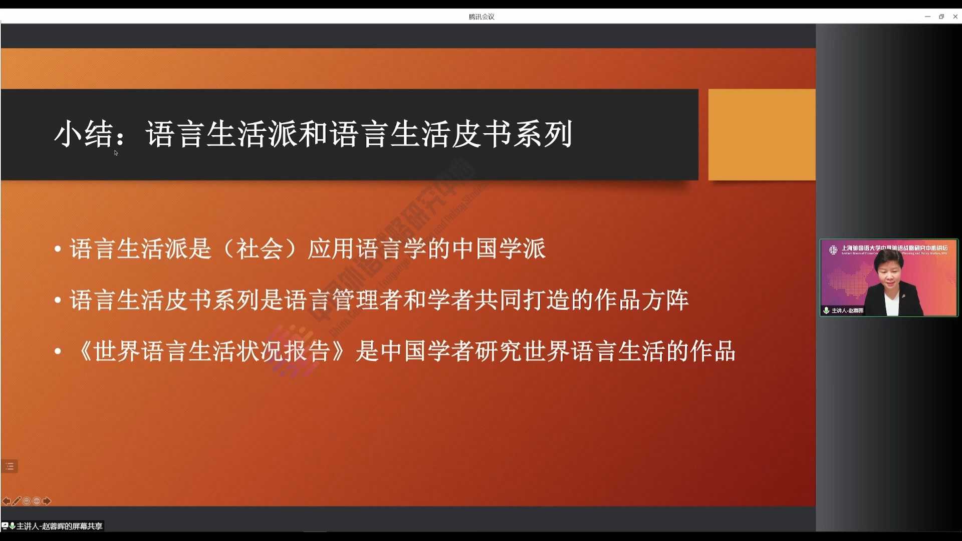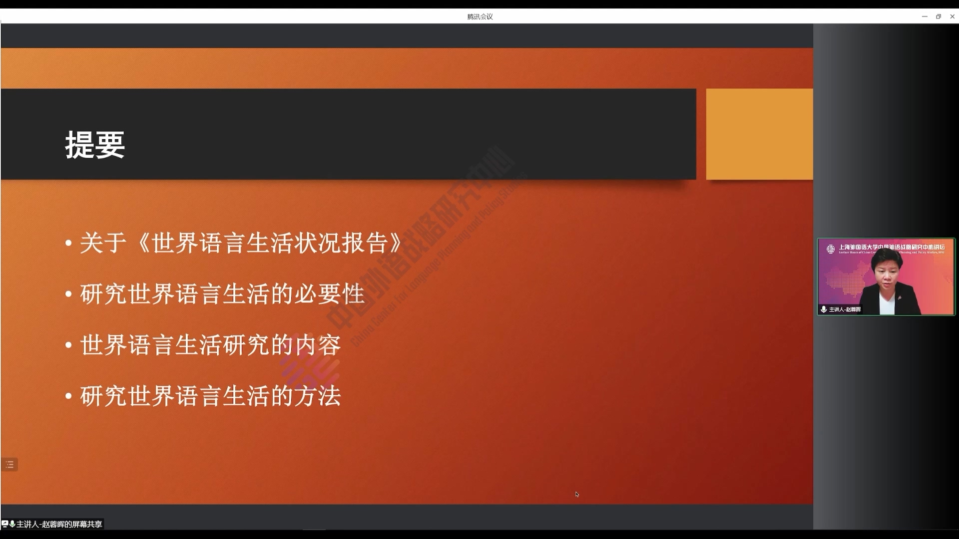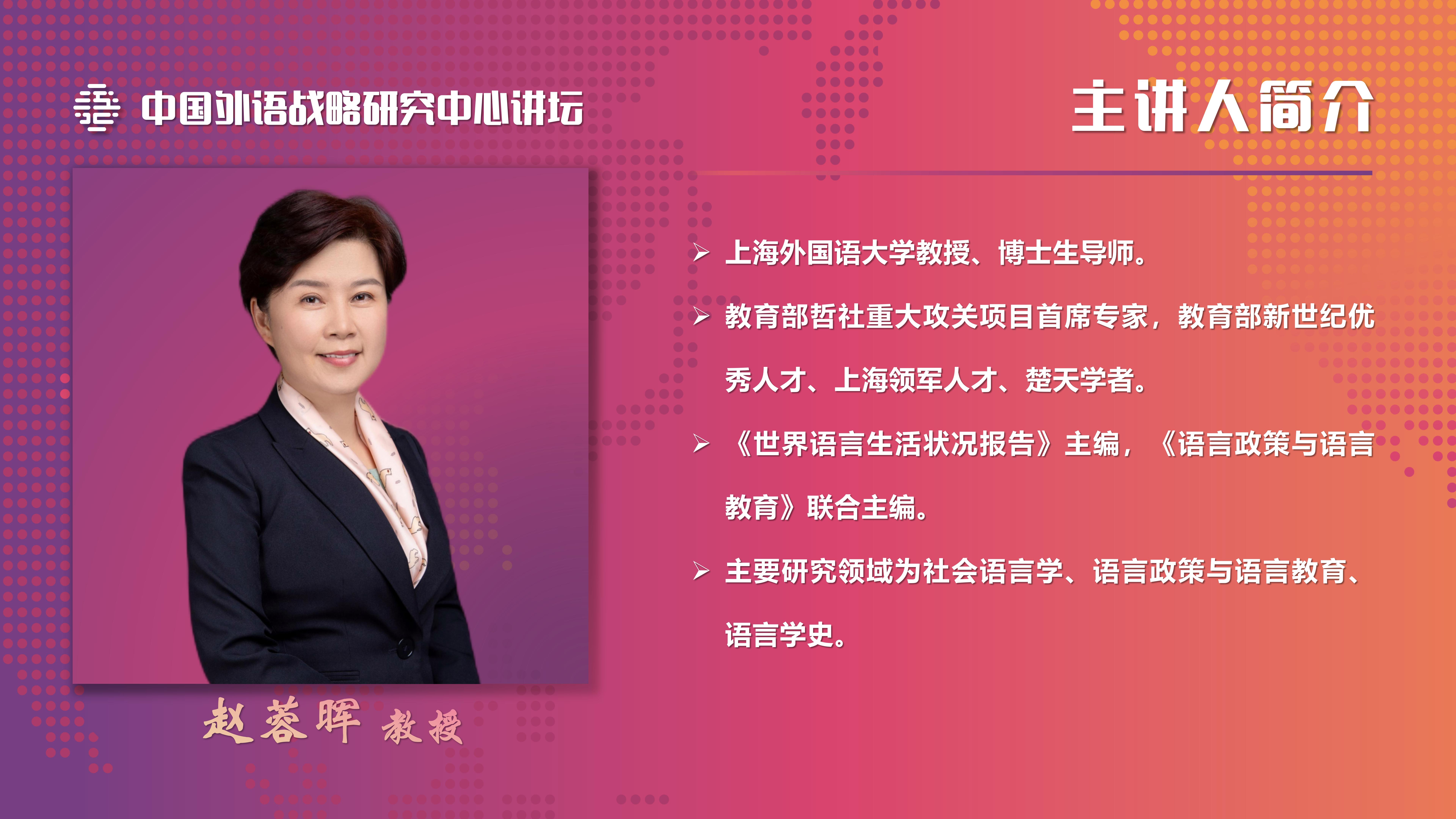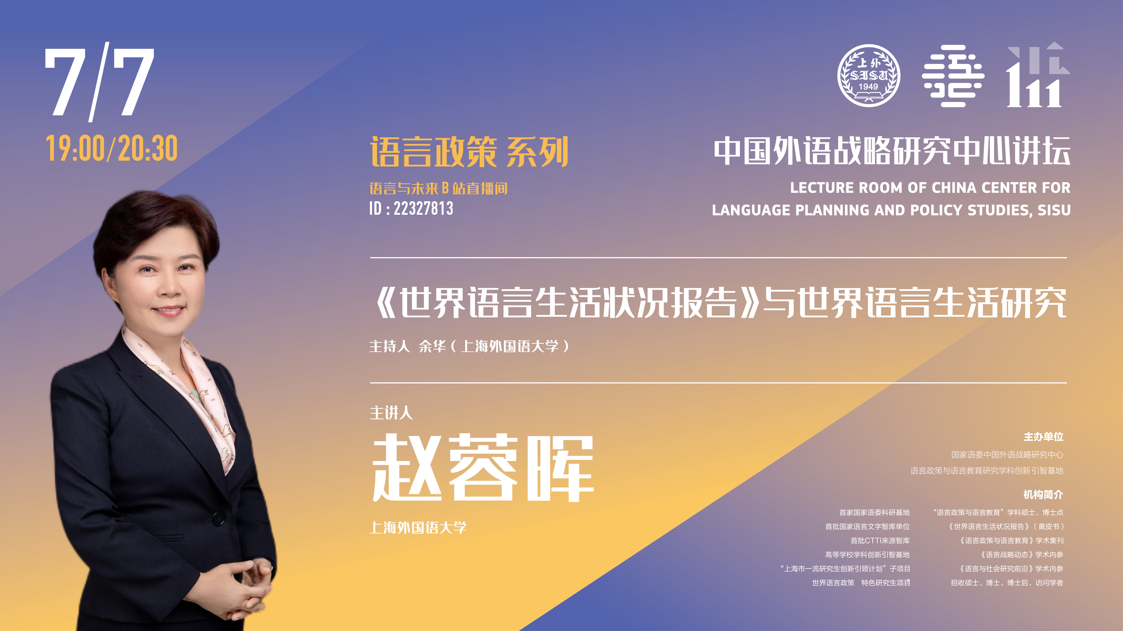 2022年7月7日晚,上海外国语大学研究生院院长、中国外语战略研究中心执行主任赵蓉晖教授在“中国外语战略研究中心讲坛”作题为《<世界语言生活状况报告>与世界语言生活研究》的学术讲座。讲座由中心研究员余华副教授主持,400余位校内外师生在线参加。