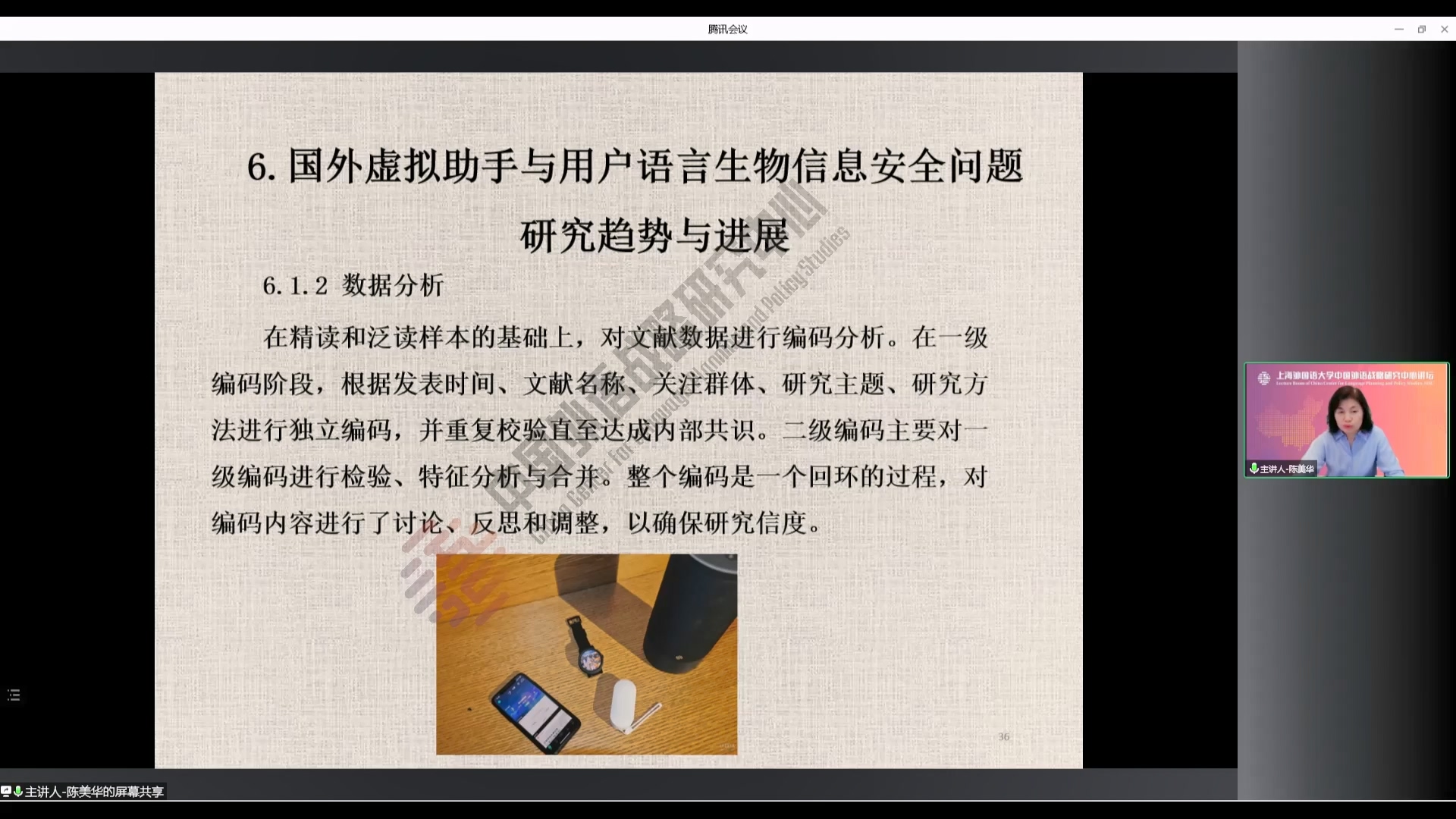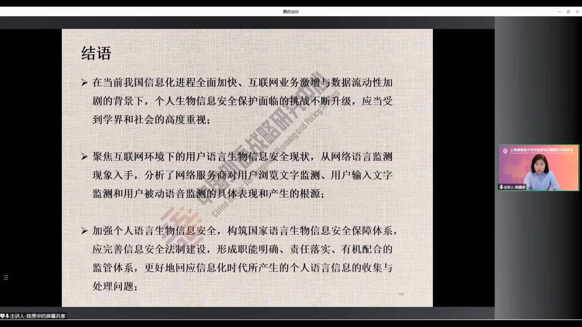 讲座伊始,陈美华教授首先介绍了生物信息安全和语言生物信息安全的概念。她指出,人类个体及群体语言表现出可识别的特征属性,从中能够提取可识别、可重复的生物特征样本数据。语言生物信息安全研究将生物安全与语言学科结合,对公民的信息安全、国家的战略布局、学科视野的延展、语言学习的深化具有重要意义。随后,陈老师阐述了网络语言监测的分类,对网络语言监测进行了根源分析,并对此进行对策分析。她将网络语言监测分为三类,包括用户浏览文字监测、用户输入文字监测、用户被动语音监测等,从商家、供应商和法律三方面解释了网络语言监测现象的根源,即以商业利益为终极目标的市场竞争、供应商过度操纵用户个人信息,以及法律监管有待完善。针对这些现象,陈老师提出如下对策,完善个人生物信息保护的法制建设、明确网络服务商保护用户生物信息安全的主体责任、提升用户对个人语言生物信息的重视程度和保护能力。接着,陈老师从研究方法、研究结果、研究主题、关键趋势多方面出发,以国外虚拟助手与用户语言生物信息安全问题研究为例,探讨如何结合我国实际情况开展网络语言监测与语言生物信息安全研究,为我国语言生物信息安全问题提供思路和启示。