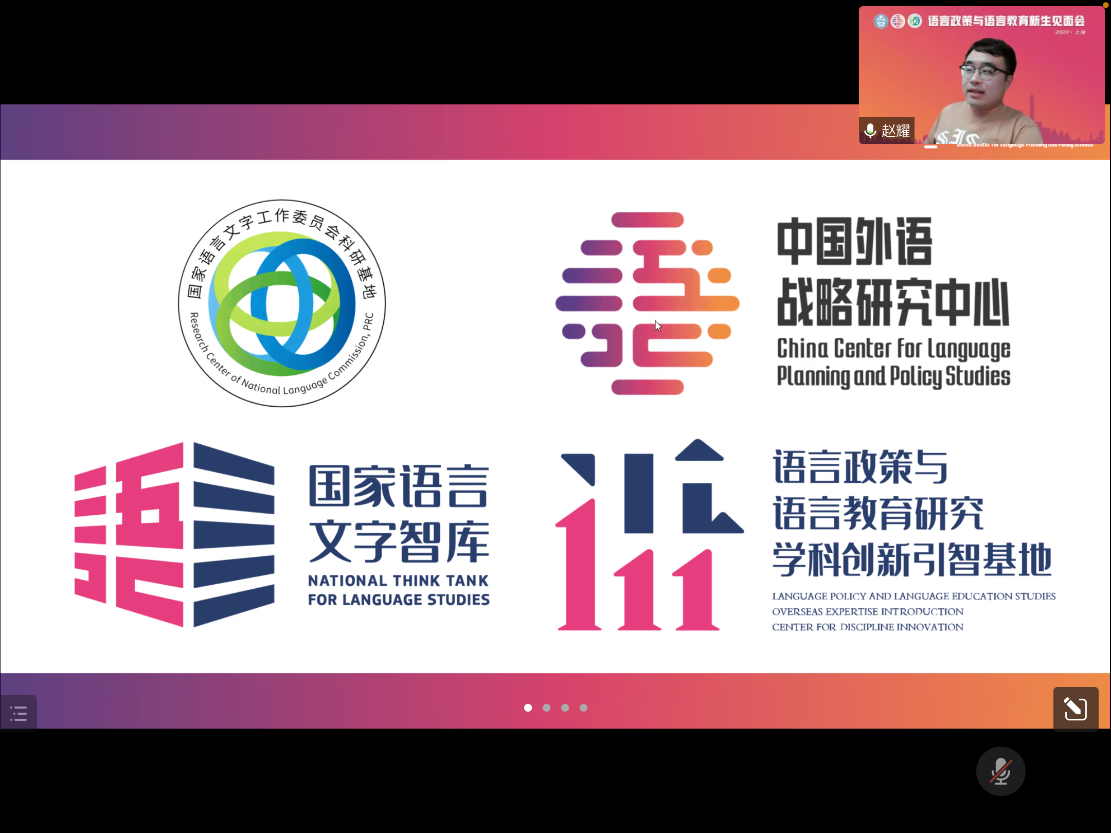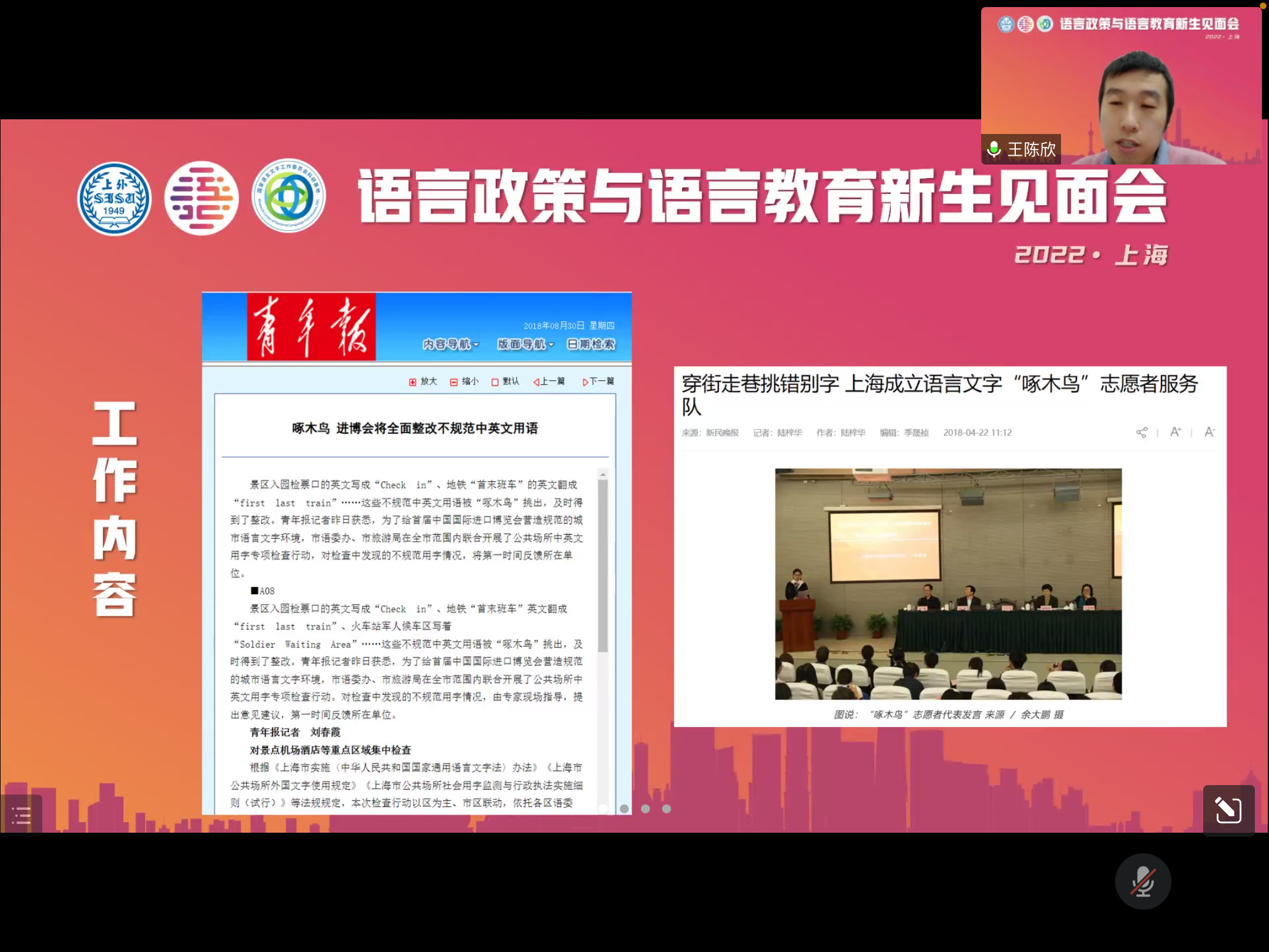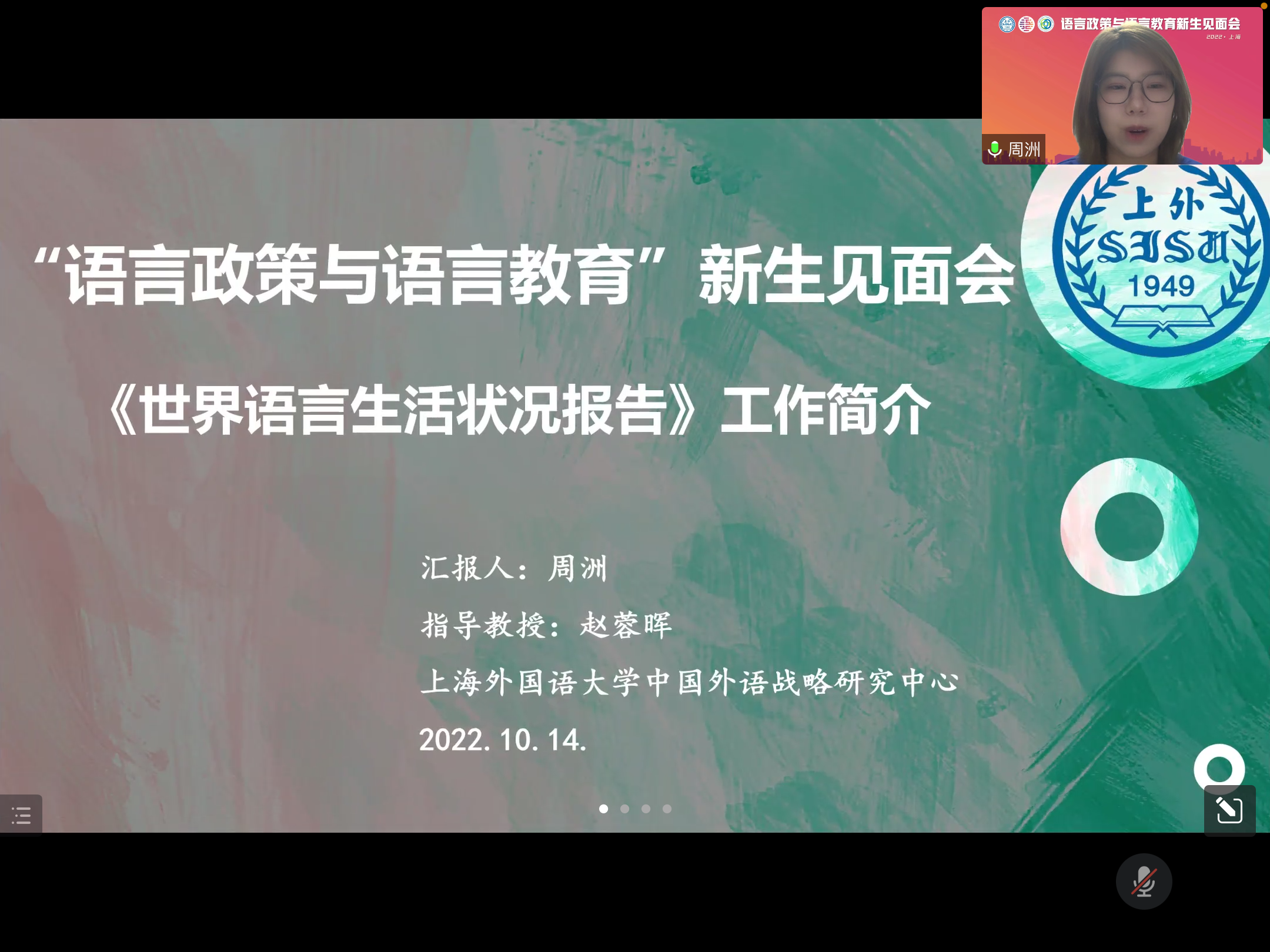 在老生代表分享环节。2019级博士生邓世平分享了自己关于学术研究的几点体会,从几种意识的培养、方向与选题的形成、方法与工具的运用、文章的修改与投稿以及中心的培养与资源五个方面进行了系统介绍。2020级博士生周洲介绍了黄皮书《世界语言生活状况报告》的相关工作,就基本情况、工作组提供的支持和写作事项展开了细致讲解,并鼓励感兴趣的同学参与其中。2019级博士生王陈欣讲解了目前学生工作的几大方面,如师生联络、信息收集和活动组织等,随后还介绍了上海市“啄木鸟”志愿者工作主要内容。2020级博士生赵耀介绍了新媒体和《语言战略动态》工作,对刊物的发展情况、目前编务团队的构成机制和招募信息作了讲解,随后介绍了中心讲坛目前的工作以及未来的发展目标,并希望有更多的同学能投入运营建设。2022级博士张勇晨向新生同学们就中国外语战略研究中心的网站建设展开介绍,从网站栏目的设置、基本的设计理念以及目前正在建设的部分作了详细展示。