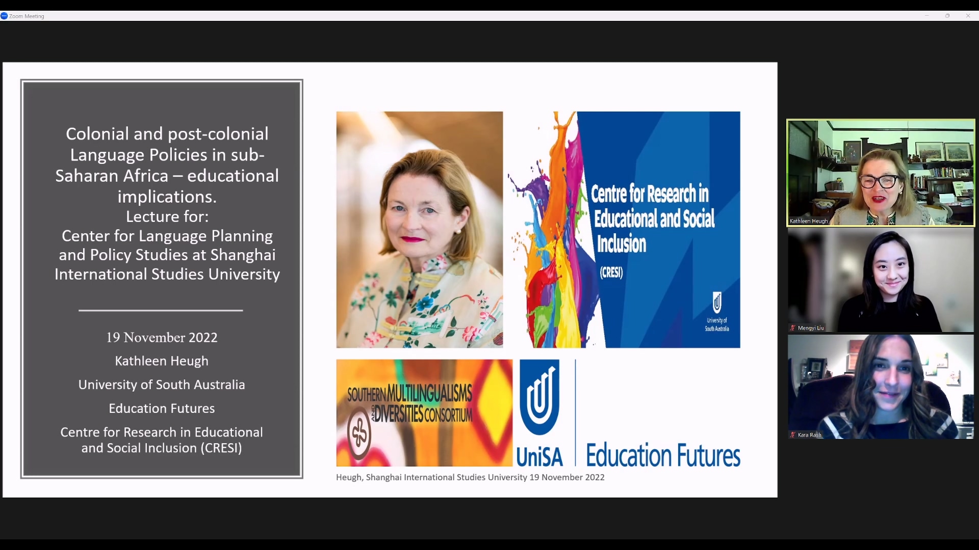本次工作坊强调深度学术阅读与交流,由主讲人及作品介绍、主旨讲座、学术对谈和问答互动四个部分构成。中心的两位研究生尹春敏和吕天雄首先围绕Kathleen Heugh教授的学术经历和学术作品做了简要介绍,他们将教授关于该主题下的文献作品和自己的研究方向结合起来,对主讲人的研究做出了观点提炼,并就自己感兴趣的观点提出问题。爱荷华州立大学的两位学生代表Kara和Liu Mengyi也对Heugh教授在非洲所做的多语教育历史梳理和批判研究进行了介绍。Heugh教授对四位学生的引入介绍及思考表示感谢并给予赞许。