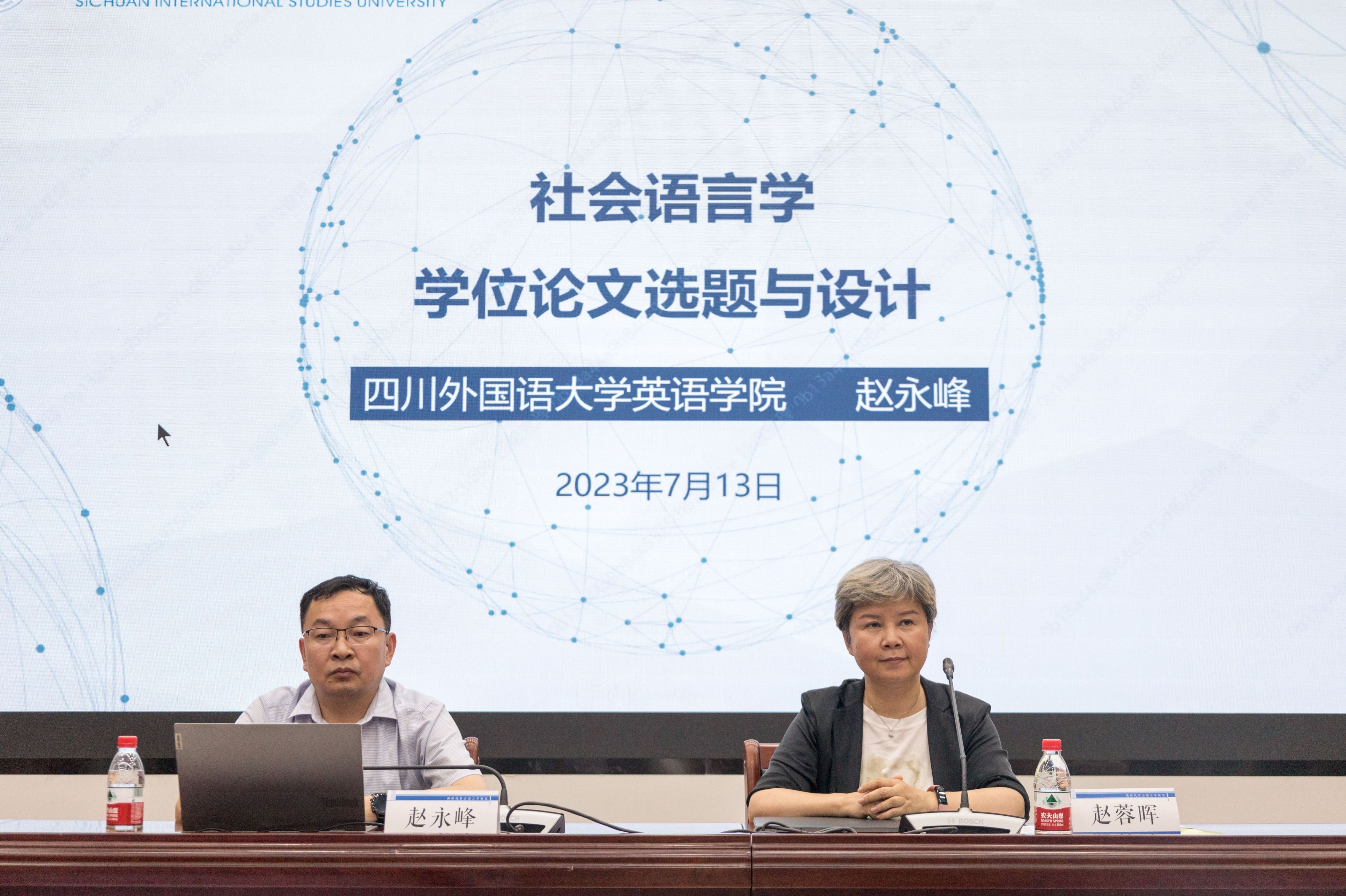 第一场工作坊题为《研究生学位论文选题与设计》,由四川外国语大学赵永峰教授和上海外国语大学赵蓉晖教授共同报告。赵永峰教授首先结合具体实例,着重讲解了社会语言学研究的十大选题方向及选题要点,并在此基础上讲解了如何确定研究方向以及如何做好研究设计。赵蓉晖教授则对学位论文的基本特点、功能与定位、相关制度以及基本原则和要求进行了讲解,并详细分析了学位论文写作的完整过程,对完成学位论文的时间分配与管理给出了具体建议。