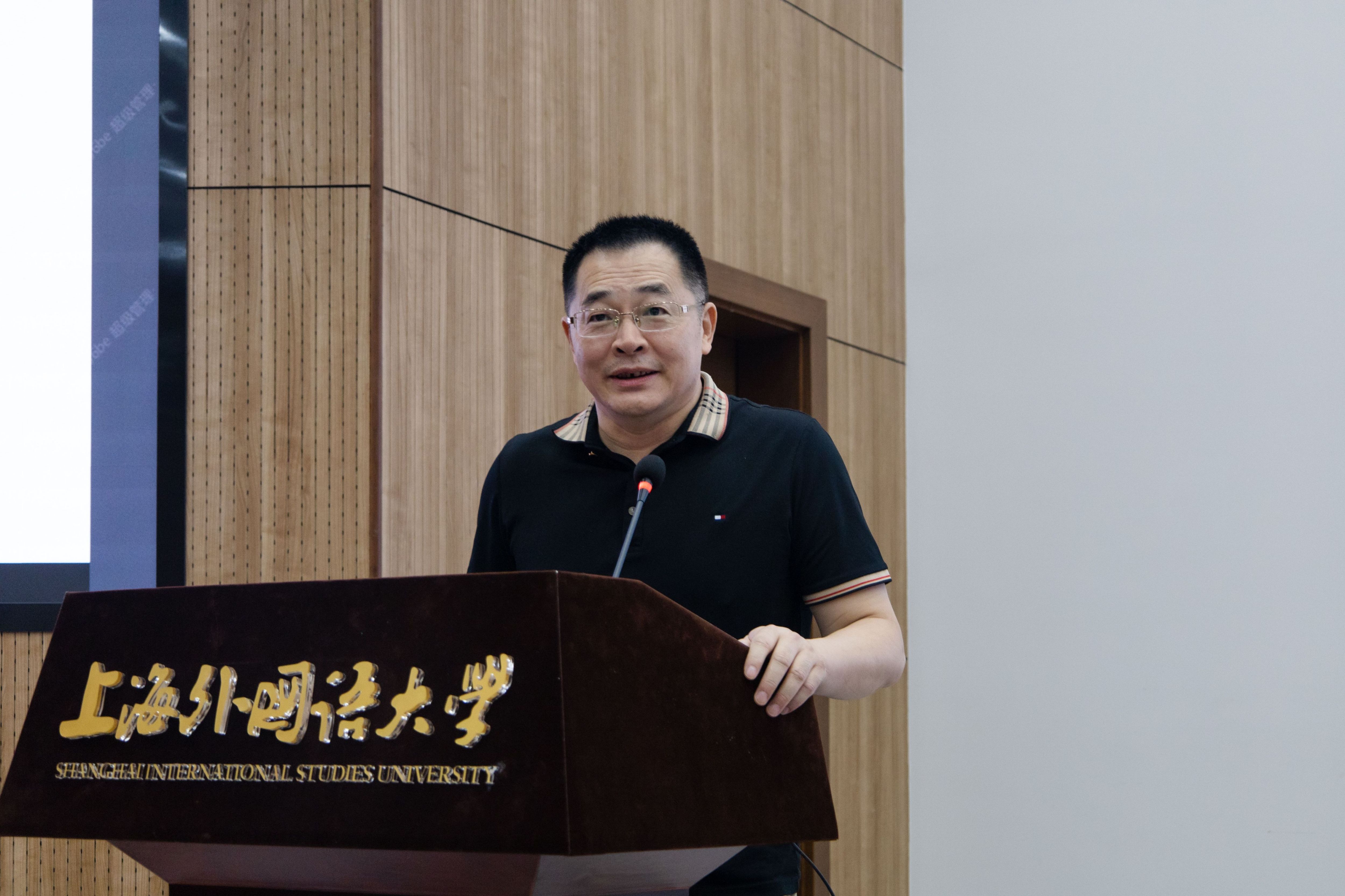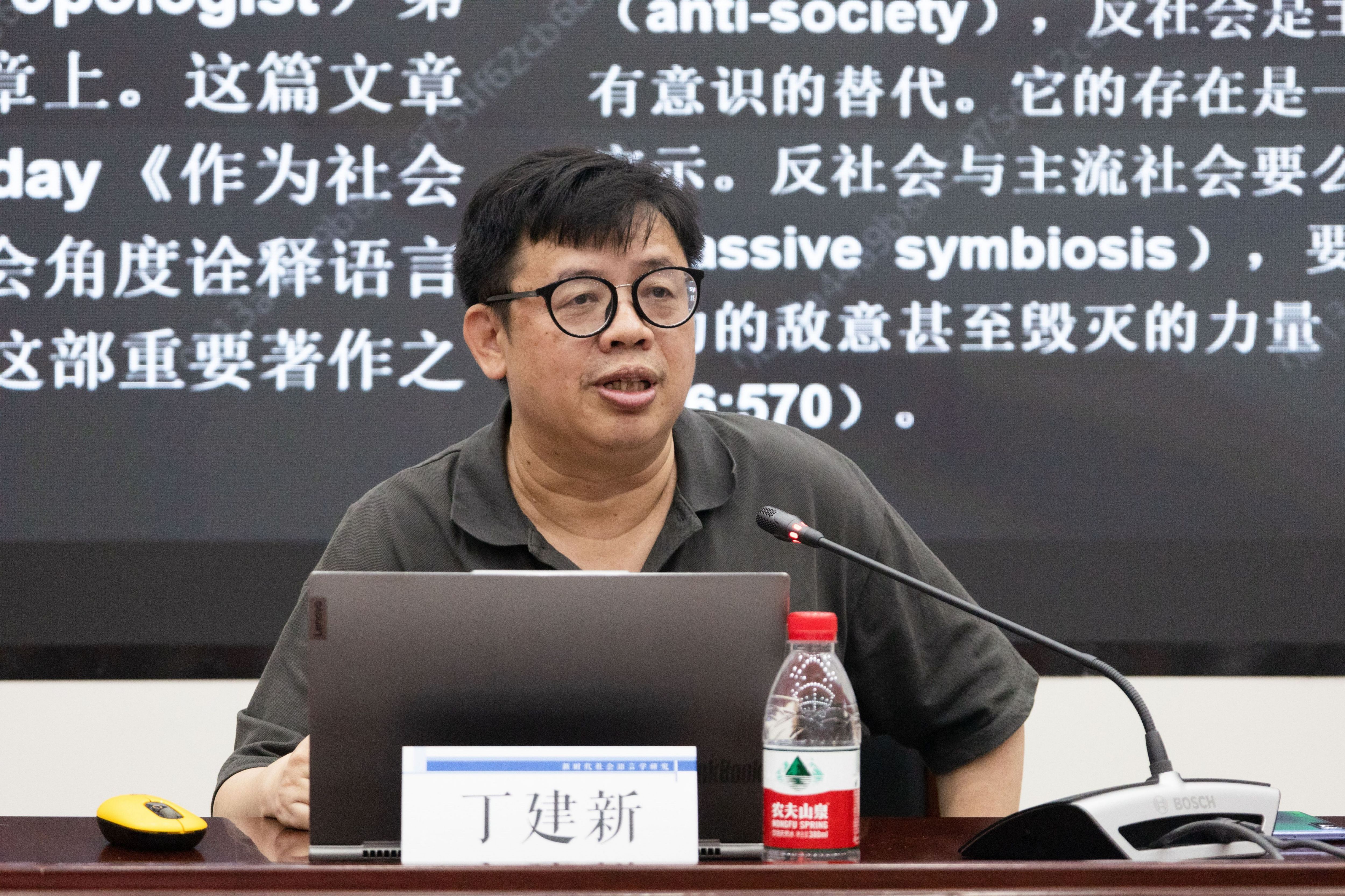 中山大学丁建新教授进行了题为《批评性社会语言学——从“反语言”到“边缘话语分析”》的专题报告。他首先介绍了“反语言”这一概念的来源及相关的研究情况,强调语言的“异质性”,认为语言能够在促进社会转型与变革中发挥作用。随后在“反语言”的基础上,他继续讲解了“边缘话语分析”的一些基本理论问题,指出其是一种以社会关切为本的后现代主义话语分析范式,关注话语与文化的不平等,并试图打通话语批评与文化批评之间的阻隔。