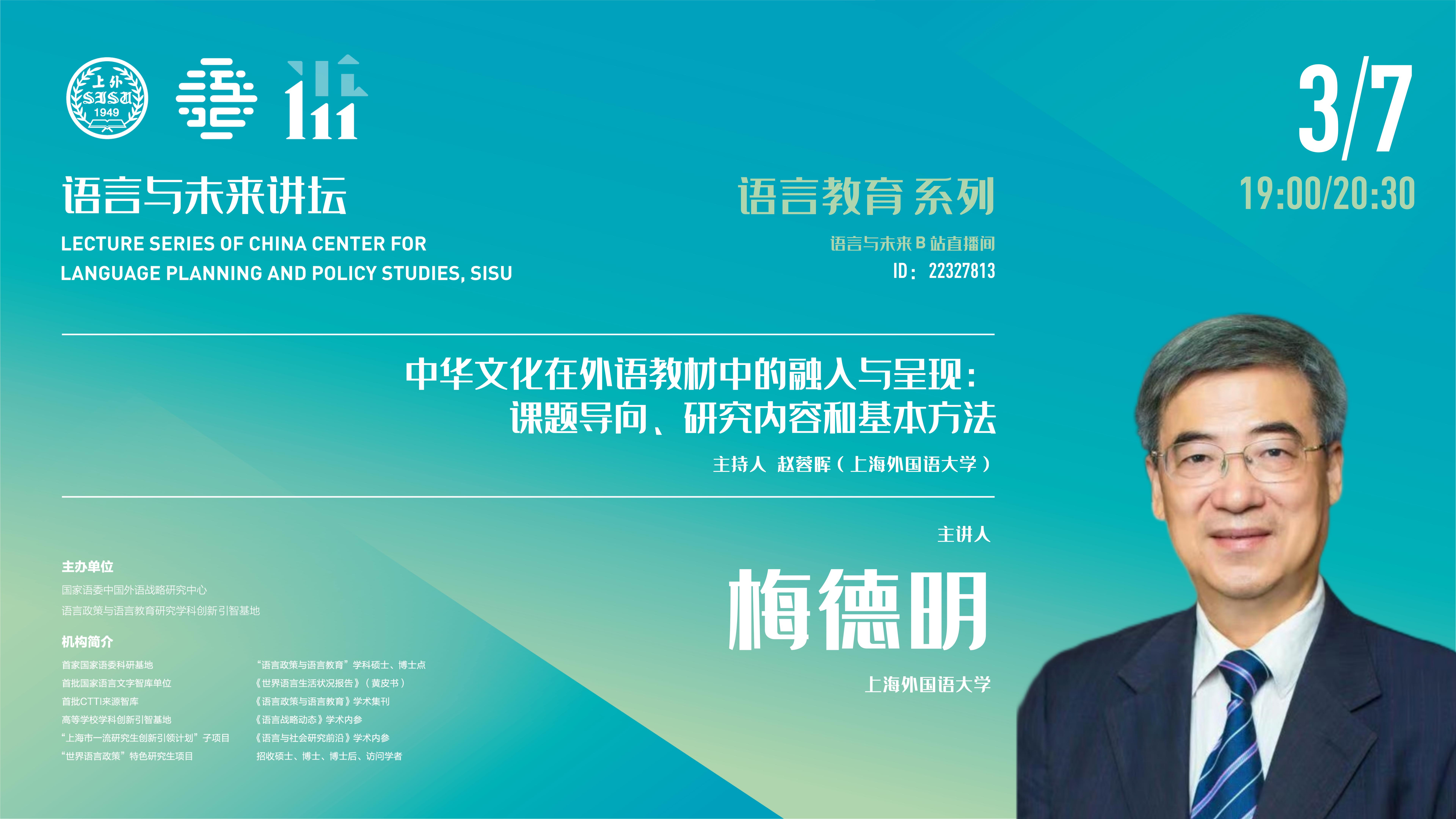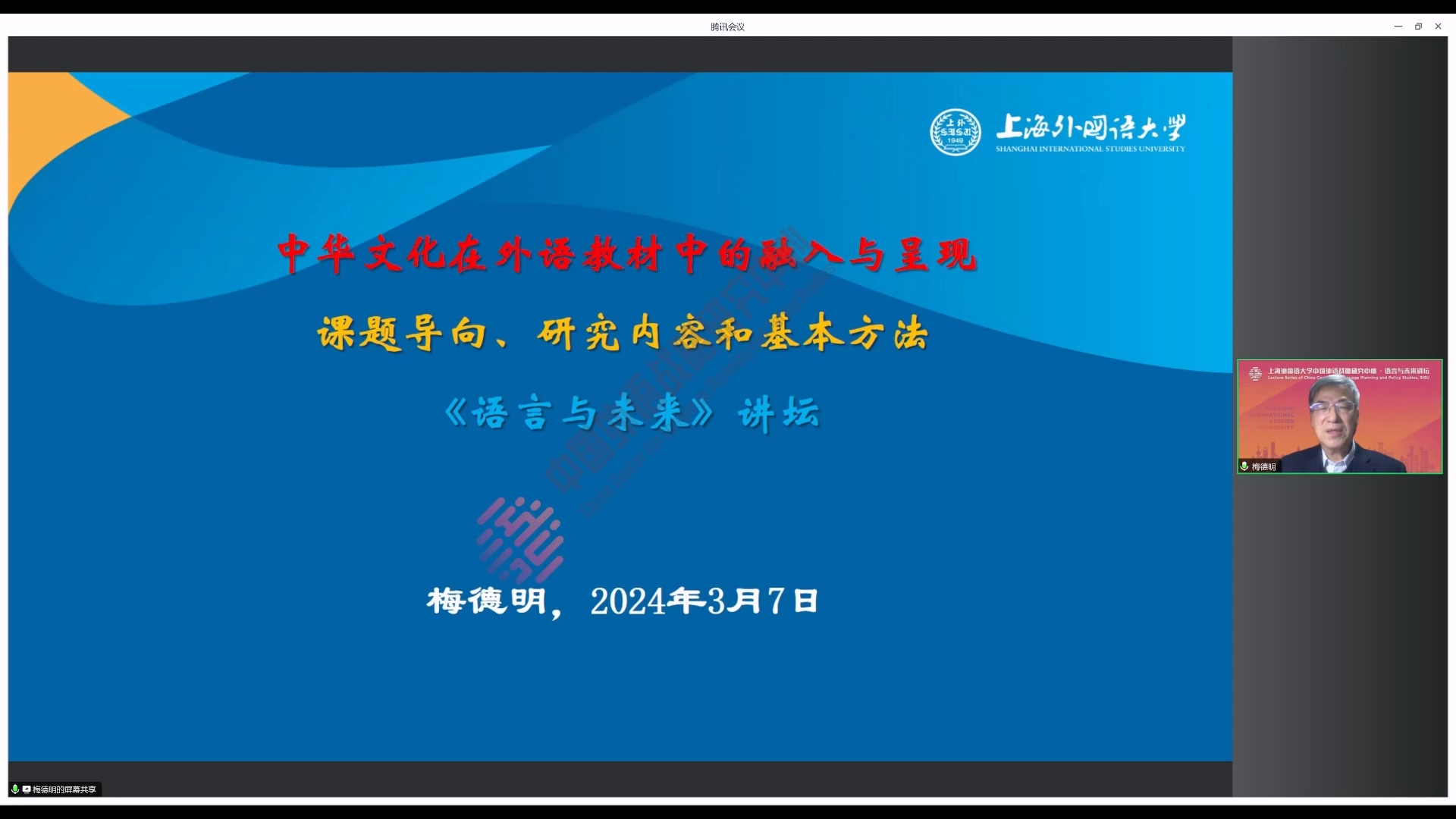 2024年3月7日,上海外国语大学教授、博士生导师、中国外语战略研究中心学术委员会主任、国家教材委员会专家委员会委员梅德明教授做客中国外语战略研究中心“语言与未来”讲坛,做了题为《中华文化在外语教材中的融入与呈现:课题导向、研究内容和基本方法》的学术讲座。讲座由中国外语战略研究中心执行主任赵蓉晖教授主持,超过500名校内外师生在线参加。