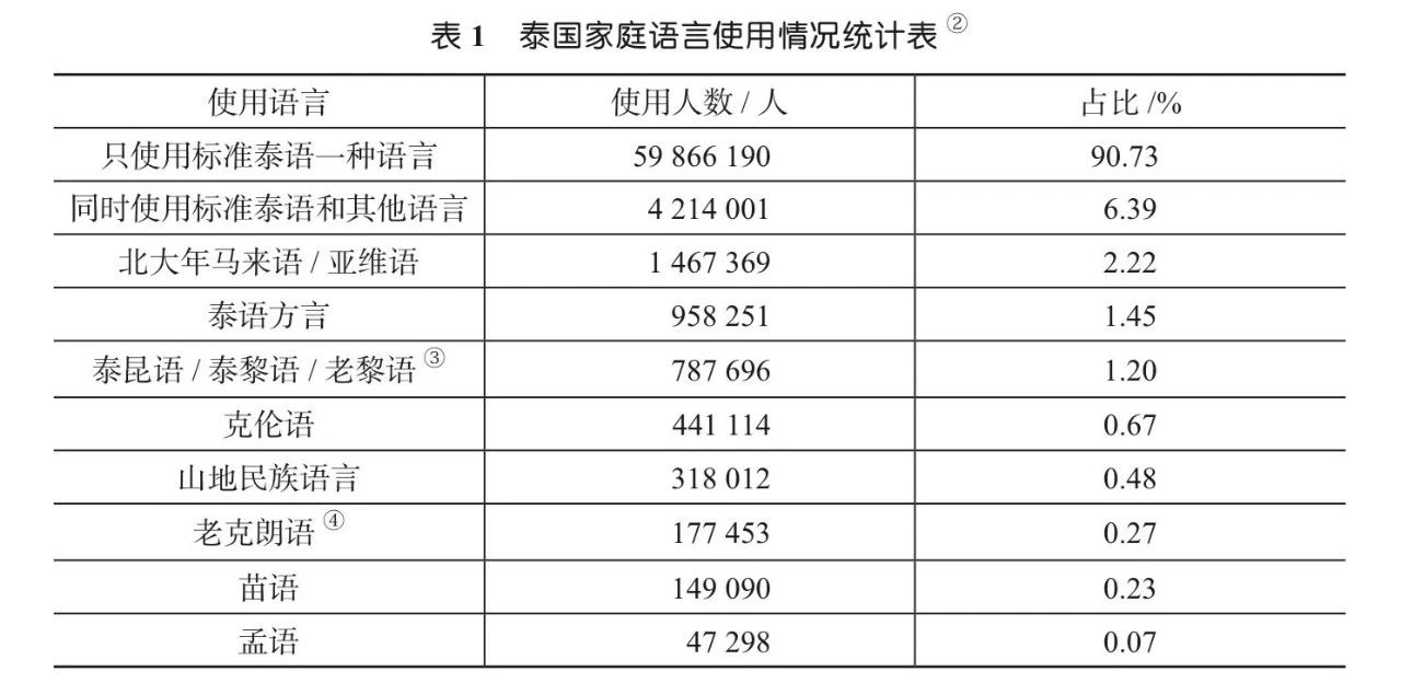 泰国是一个多民族多语言多文化的国家,共有70多种语言,分别隶属于5大语系。国家通用语—标准泰语的地位稳固,它既是国家通用语,又是官方语言,同时也是首都的主要语言、教育语言和文学语言。根据2010年泰国全国人口和家庭普查数据,泰国总人口为65981659人,家庭中的语言使用情况如表1所示: