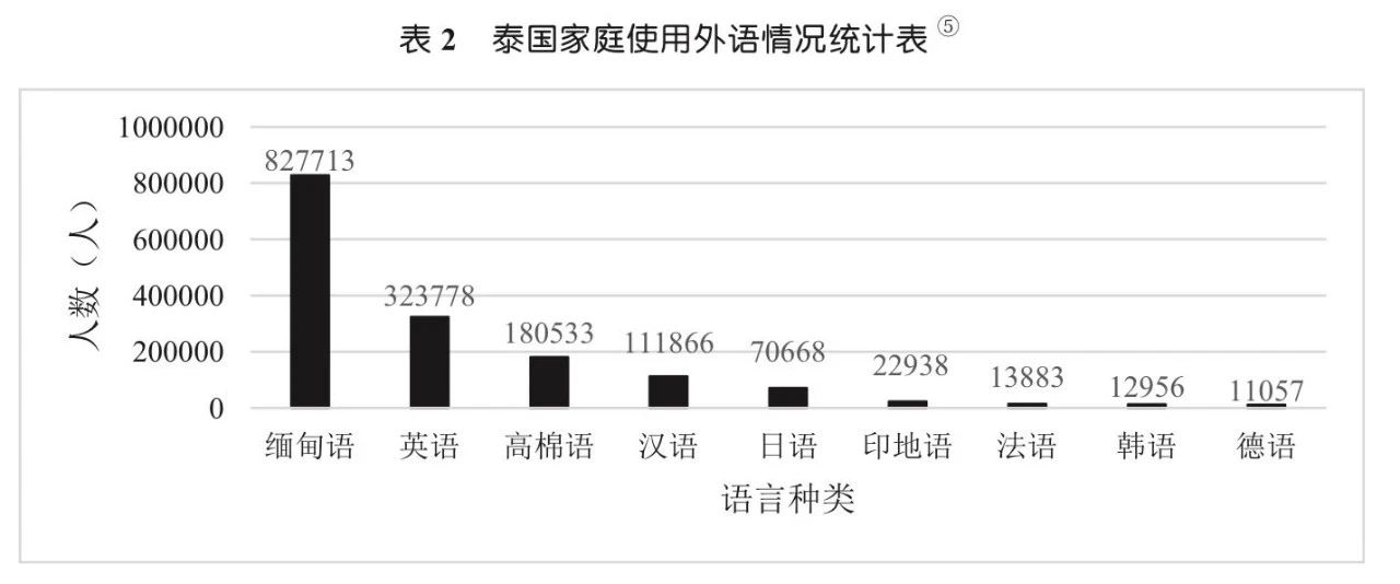 泰国家庭中使用人数最多的前10种外语如表2所示: