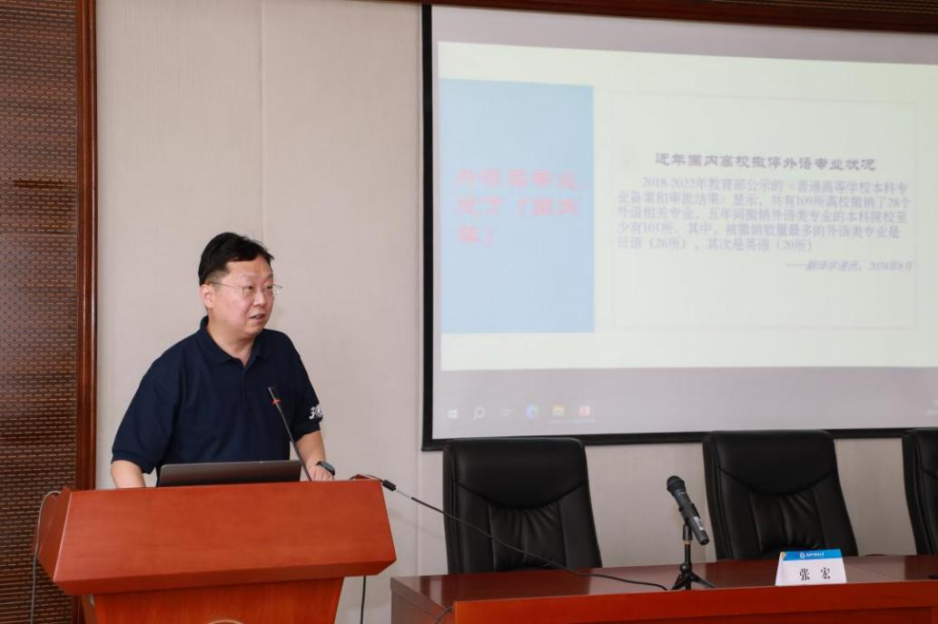 张宏副总编做了“对当下外语类学科建设和发展的若干思考”的主旨报告。他简要回顾了我国外语类学科自新中国成立以来取得的长足发展,同时,对当下外语类学科建设和发展面临的全新挑战做了梳理。就新文科背景下外语类学科的地位与重新定位,外语类学科课程设置、创新发展、人工智能技术带来的冲击乃至外语类学科的生存问题外语学科教师的出路问题等展开了深入剖析,并在此基础上提出学科发展和教师发展的现实路径。