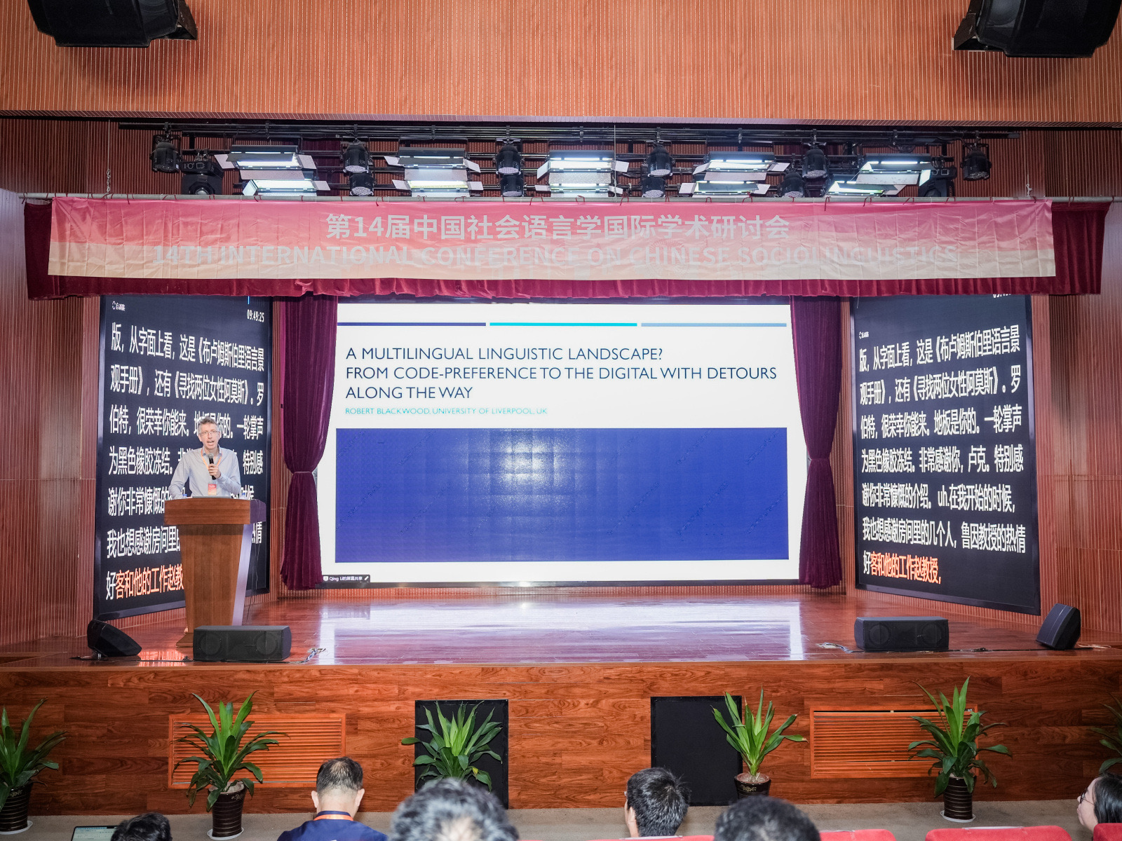 在主旨报告环节,10位国内外知名学者带来了高水平的学术报告。上海外国语大学赵蓉晖教授从人工智能技术的视角出发,探讨了垂直领域语言模型的社会语言学基础;英国利物浦大学的布莱克伍德(Robert Blackwood)教授则以法国为例,深入分析了多语语言景观的演变与社会影响;中国石油大学(北京)的田海龙教授则从跨学科视角阐述了社会语言学的理论进展,展示了社会语言学在21世纪的新发展;西交利物浦大学的人文与社会科学院副院长门赛尔博士(Luk Van Mensel)探讨了多语家庭中的语言使用;中山大学的丁建新教授分析了韩礼德“社会生物学”思想及其对科学哲学的贡献;俄罗斯科学院的比特克耶娃研究员介绍了俄罗斯语言政策研究中预测法和情景分析法的理论与应用;澳大利亚墨尔本大学的皮姆教授(Anthony Pym)探讨了专业翻译的前景;教育部语言文字应用研究所的郭龙生研究员提出了新时代中国语言安全的新思考;西交利物浦大学文学与翻译系主任胡婉博士展示了在多语言和多文化社会中进行翻译的描述性研究;欧洲大学塞浦路斯分校的哈拉兰博斯博士(Constadina Charalambous)探讨了(不)安全化及(不)安全作为一种社会和话语实践对语言教育乃至更广泛的社会语言学的意义。