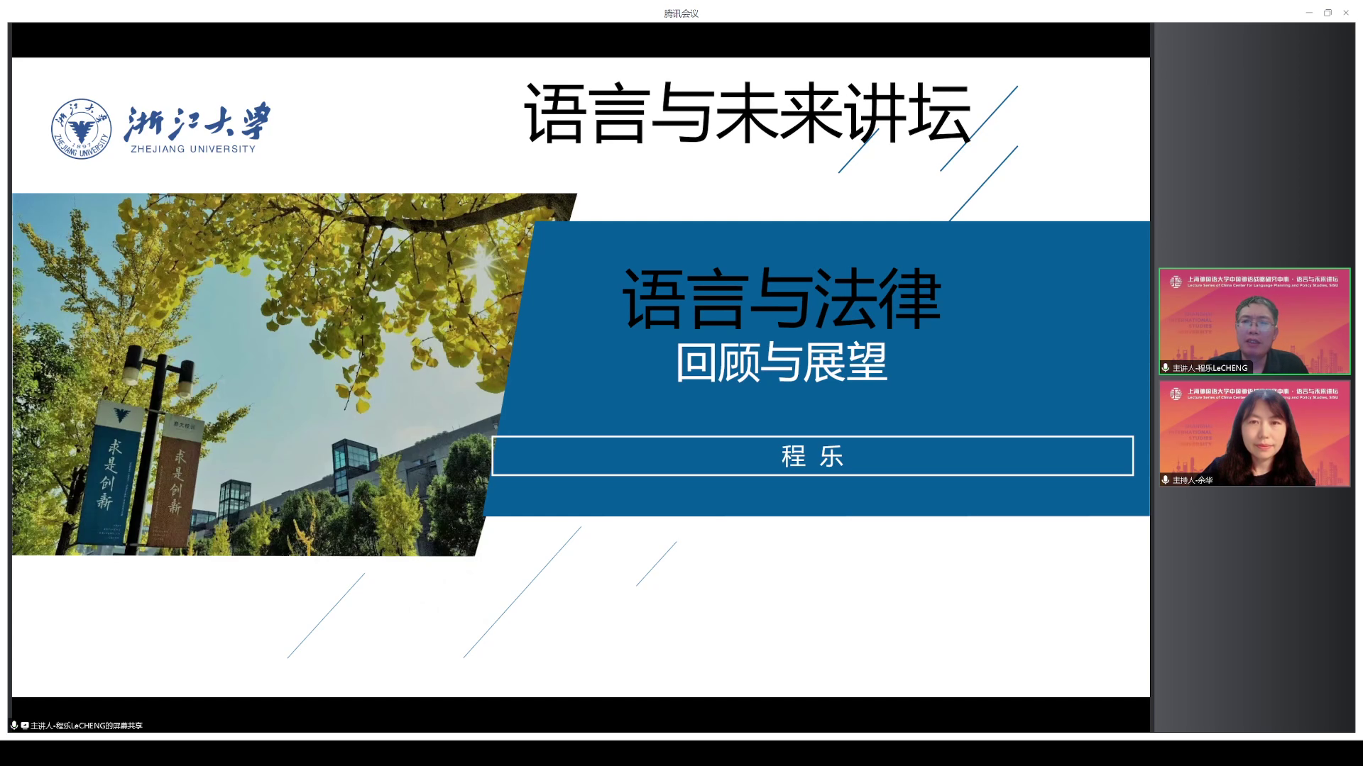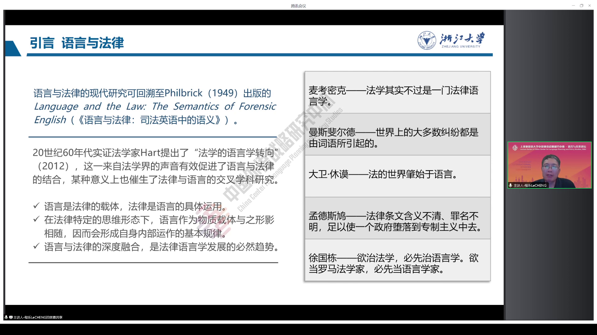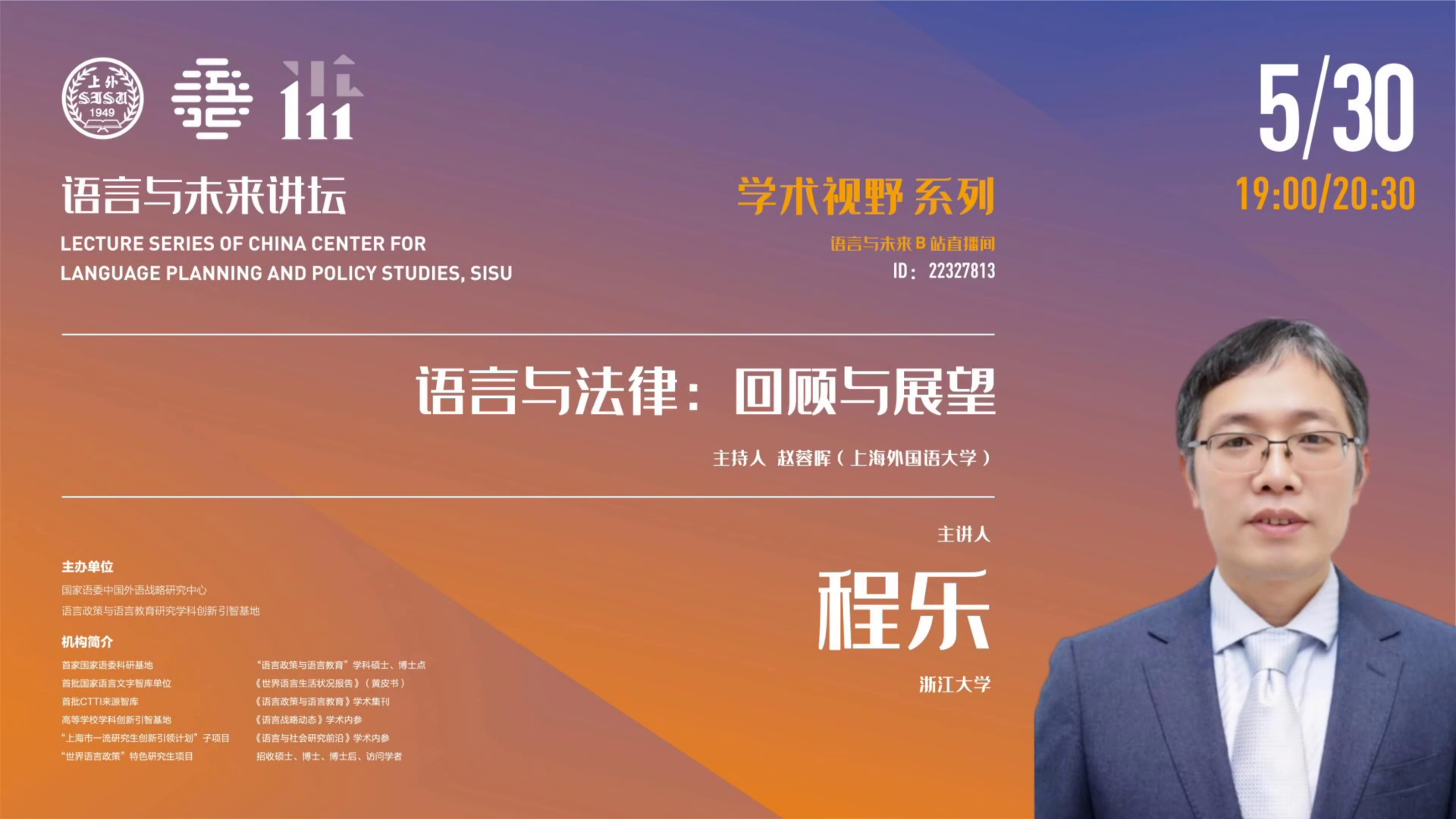 2024年5月30日,浙江大学光华法学院、网络安全学院、外国语学院程乐教授做客中国外语战略研究中心“语言与未来”讲坛,做了题为《语言与法律:回顾与展望》的学术讲座。讲座由上海外国语大学中国外语战略研究中心余华副教授主持,400余位校内外师生在线参加。