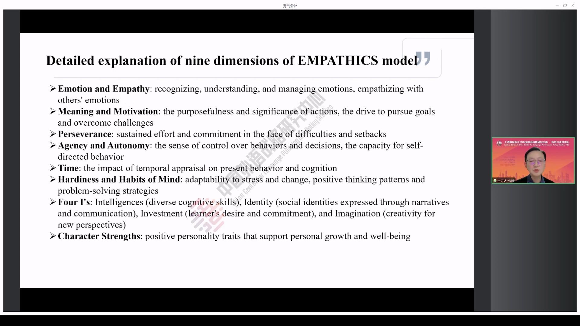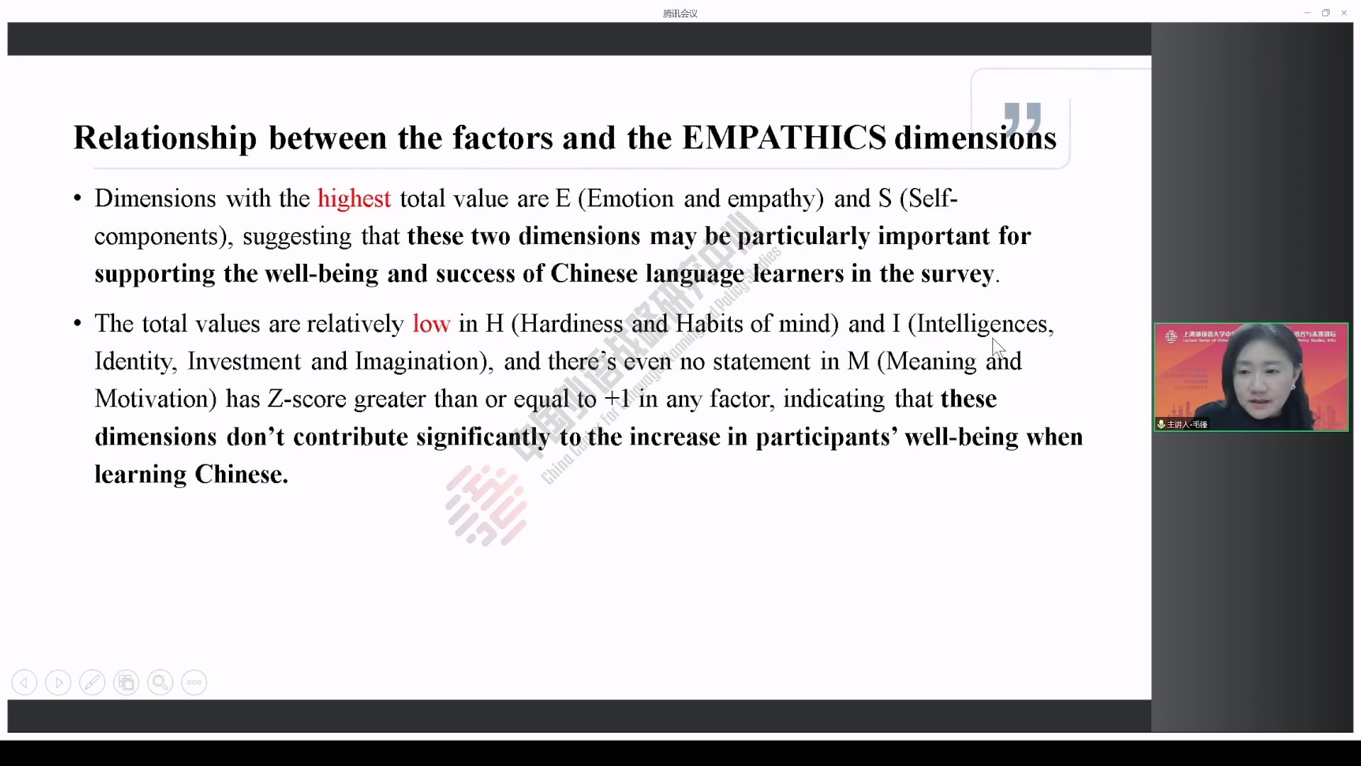接着,毛峰副教授展示了基于EMPATHICS模型的实证研究成果,重点探讨了情绪调节和学习动机对汉语学习的影响。她结合Q方法对留学生的情绪体验和学习动机进行了量化分析,揭示了不同情境下学习者的情感模式和动机差异。研究发现,情绪调节能力较强的学生在面对学习挑战时能够保持较高的动机水平,表现出更好的学习适应性。毛副教授指出,基于EMPATHICS模型的教学策略,能够有效促进学生情绪的正向调节,从而增强他们的学习投入感和语言学习成绩。通过引入情绪支持和心理调节,教师可以为学生创造更为人性化的教学环境,帮助他们应对学习中的情感困境,从而提升整体学习效果。