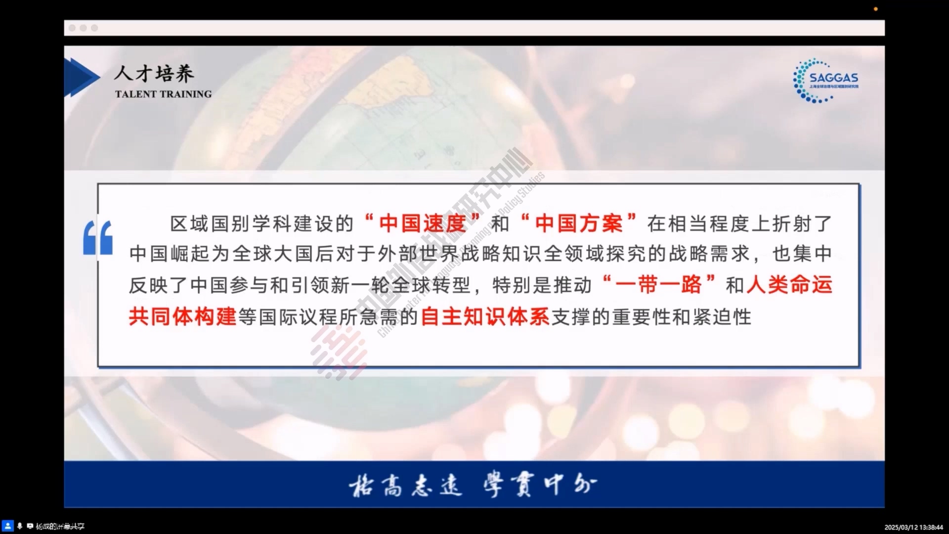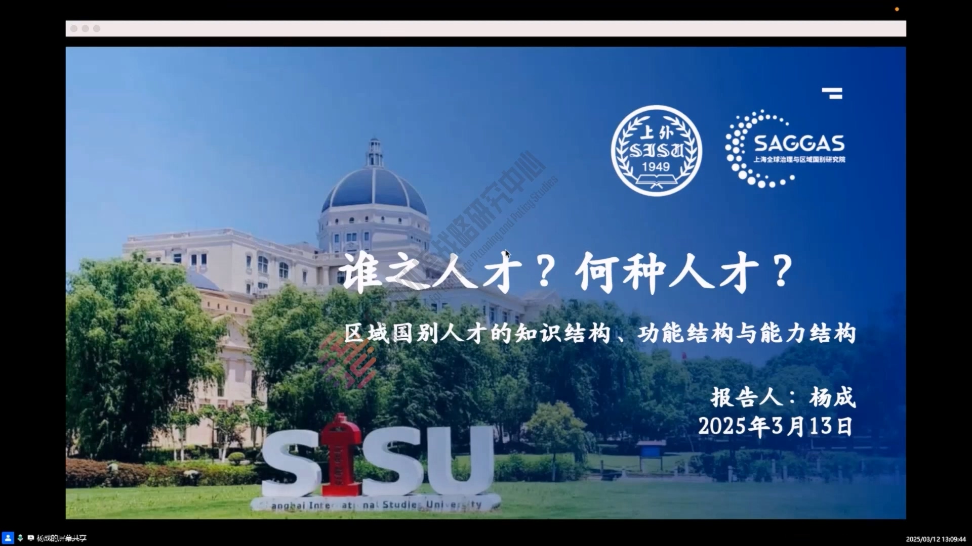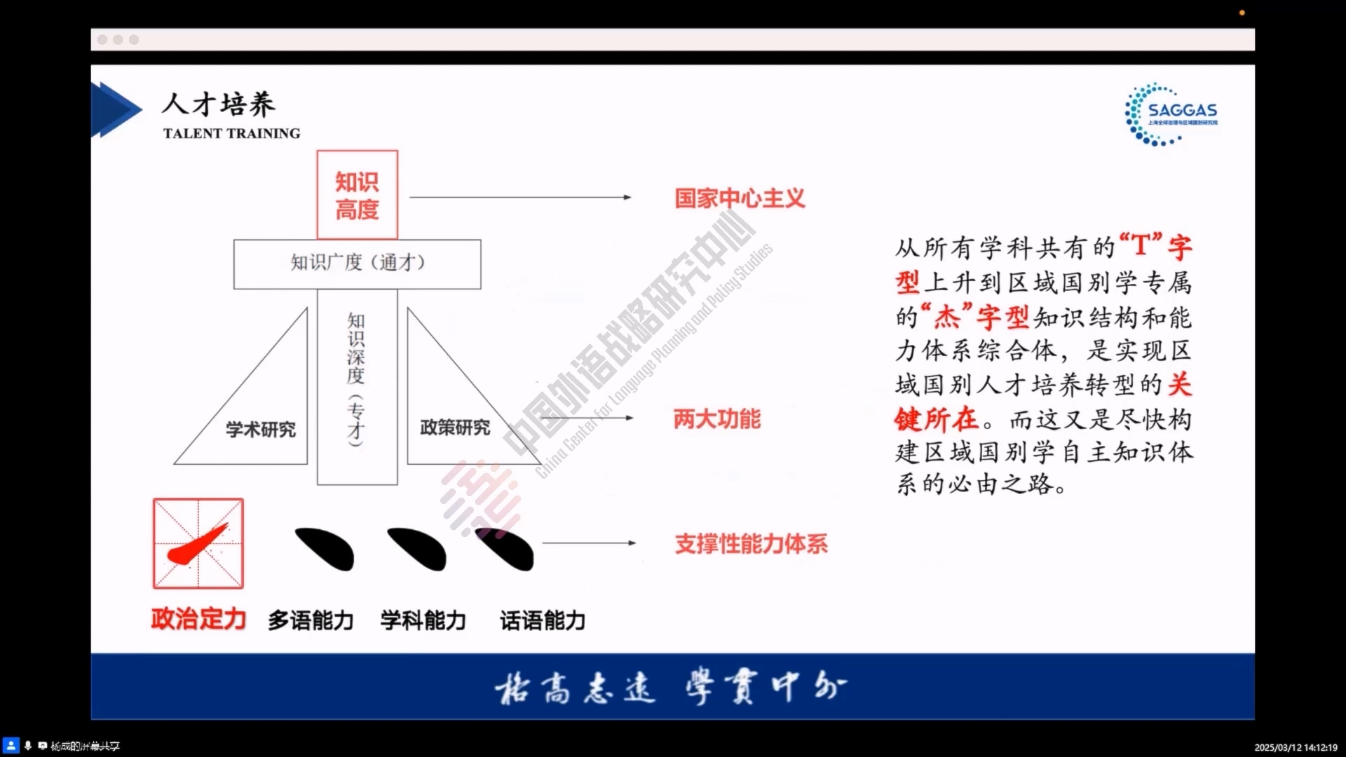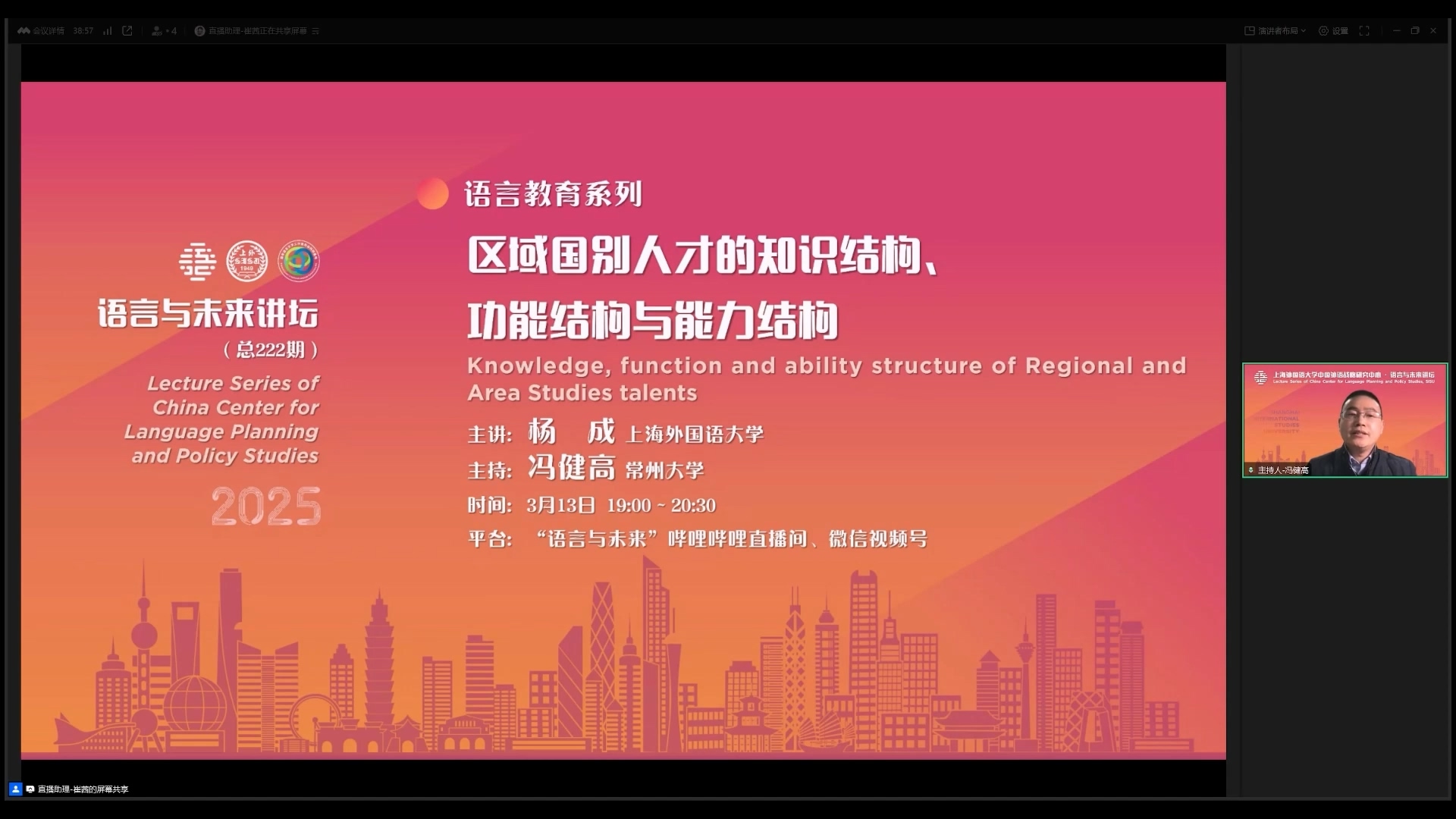 2025年3月13日,上海外国语大学杨成教授做客“语言与未来”讲坛,发表了题为《区域国别人才的知识结构、功能结构与能力结构》的学术报告。本次讲座由常州大学冯健高副教授主持,1300余位观众在线参加了本次讲座。