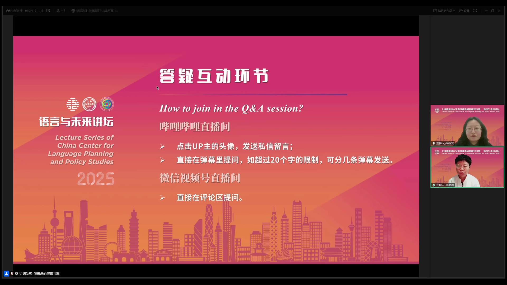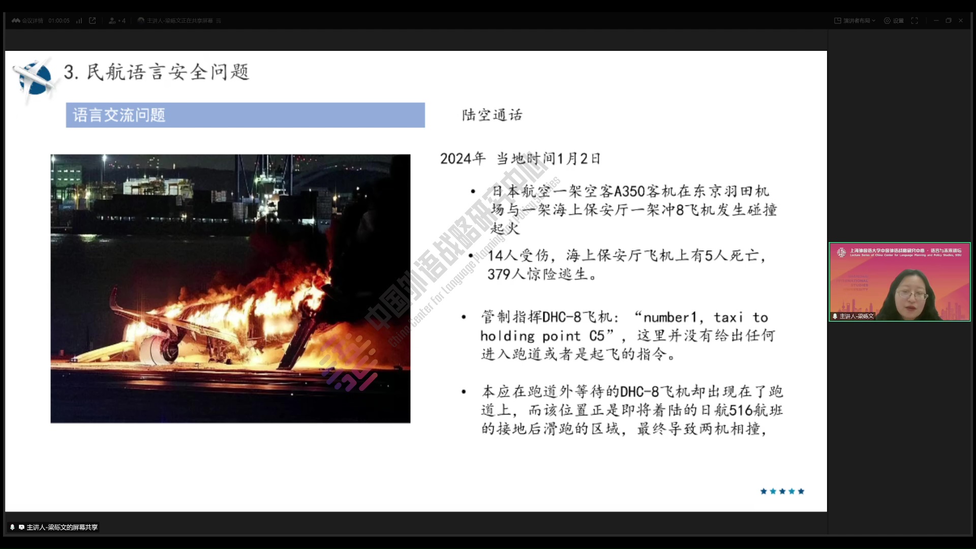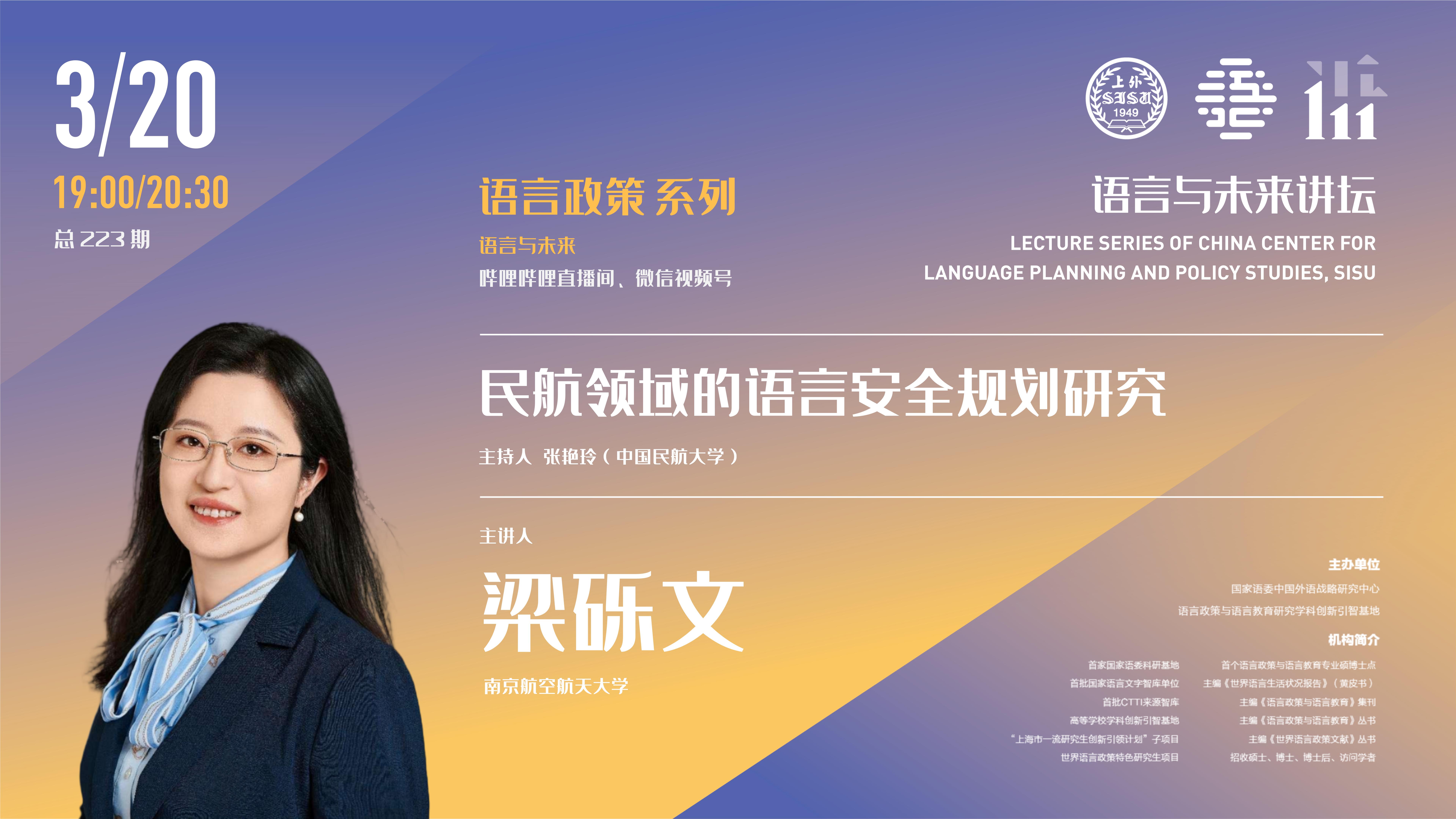2025年3月20日,南京航空航天大学梁砾文副教授做客中国外语战略研究中心“语言与未来讲坛”,做了题为《民航领域的语言安全规划研究》的学术讲座。本次讲座由中国民航大学张艳玲教授主持,数百名师生线上参加了本次讲座。