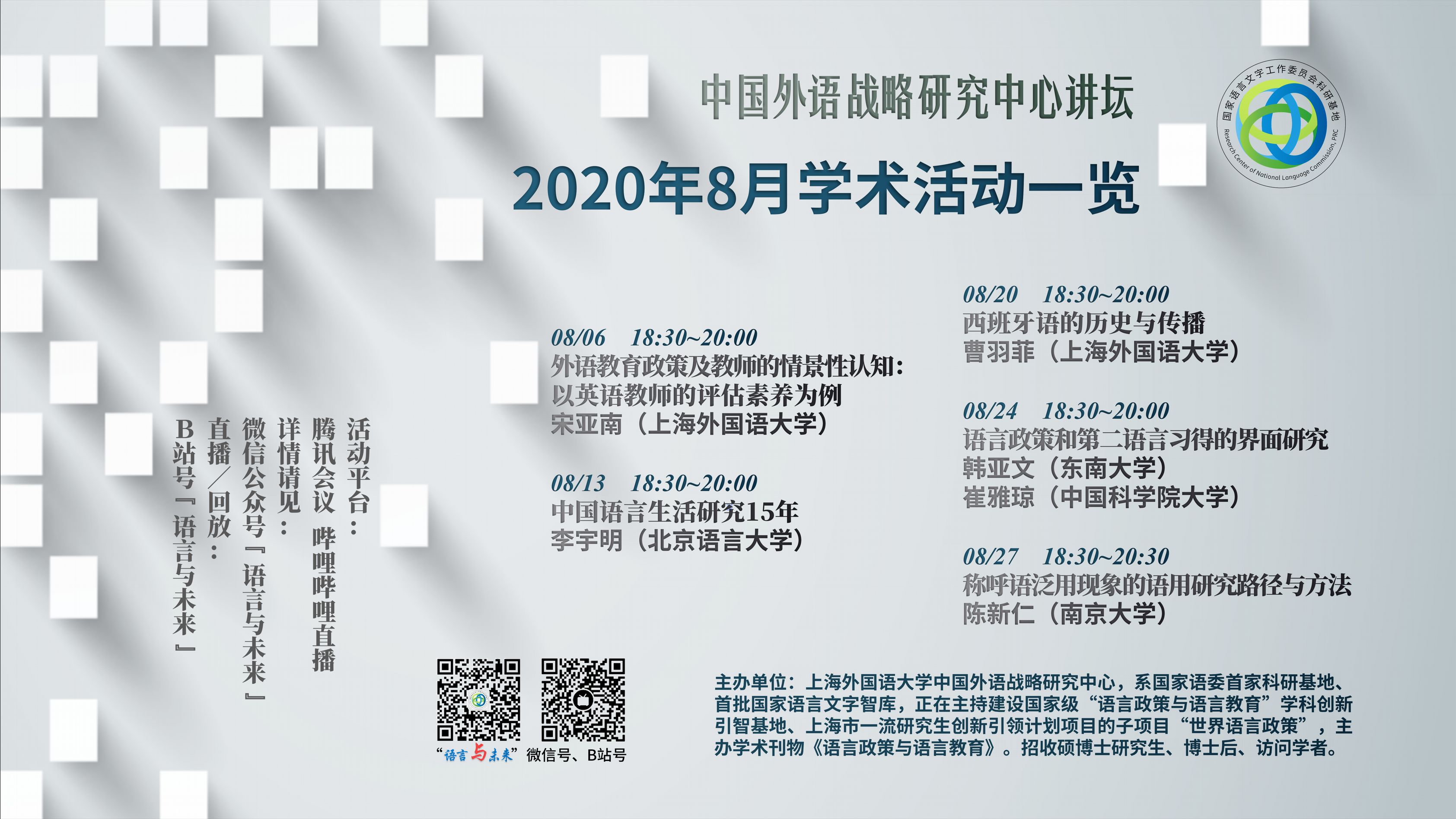 中心常年举办“中国外语战略研究中心讲坛”活动,其前身为“语言与社会工作坊”。讲坛是以语言与社会研究为核心旨趣的高质量学术交流平台,旨在向社会提供高品质学术服务。现有四个常设子系列⸺语言政策、语言教育、研究方法、学术视野。讲坛倡导以现实问题为导向的高品质学术研究,凸显世界眼光、前沿视角与跨学科意识。